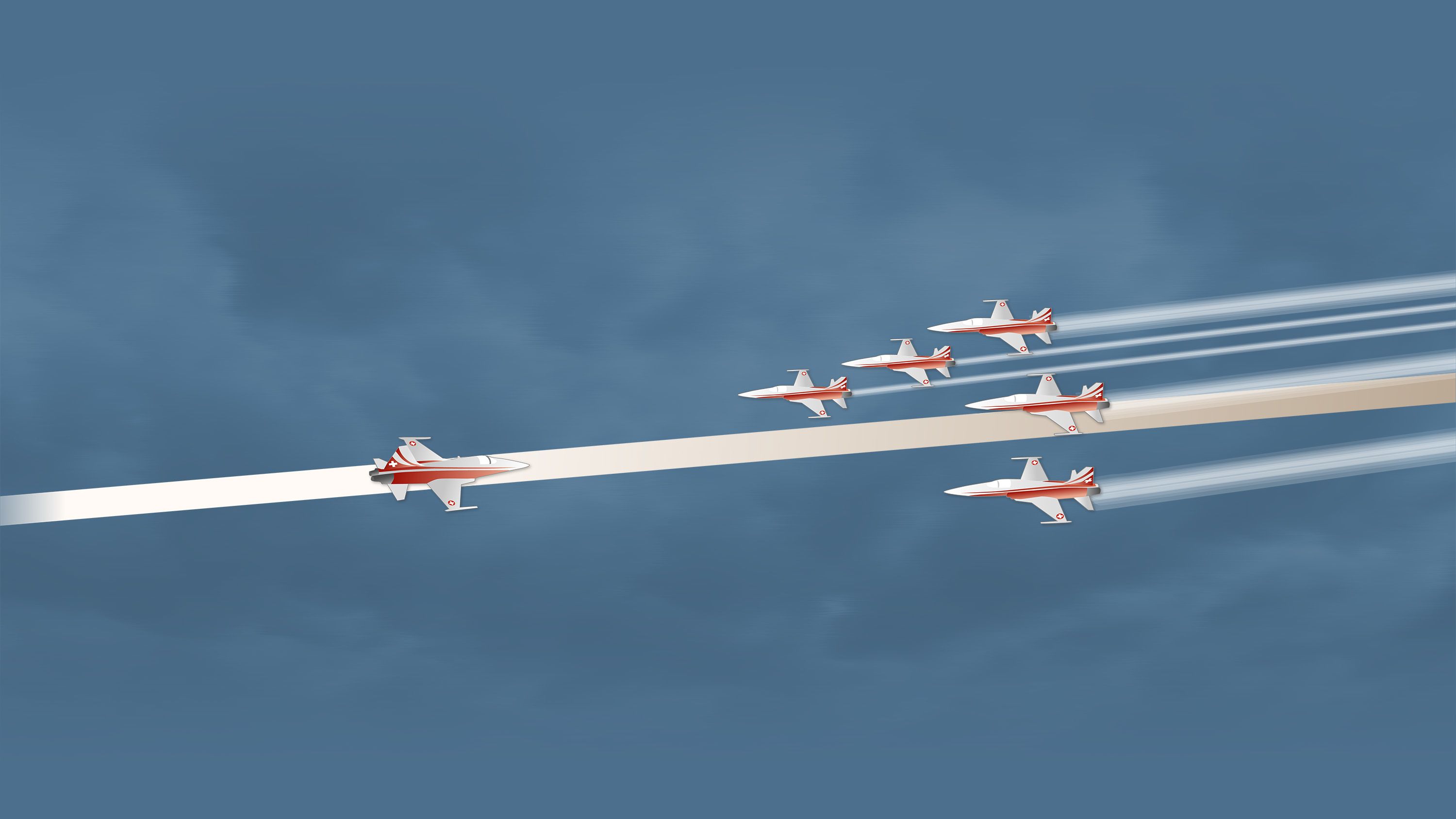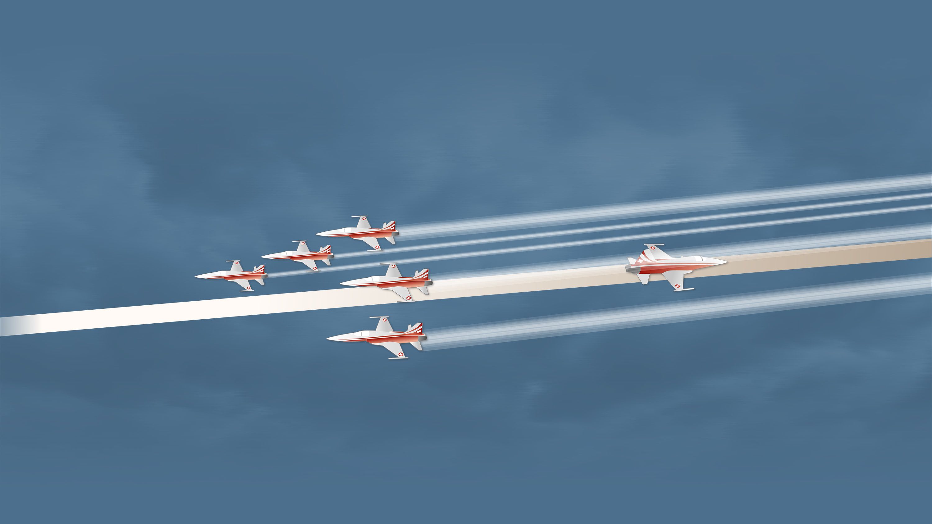 Die Kunstflugstaffel der Schweizer Luftwaffe zeichnet sich durch präzise Figuren aus und ist eine von wenigen Staffeln weltweit, die mit Überschalljets fliegt. Ihre sechs Northrop F-5E Tiger II erreichen Höchstgeschwindigkeiten von Mach 1.64 (1743 km/h).