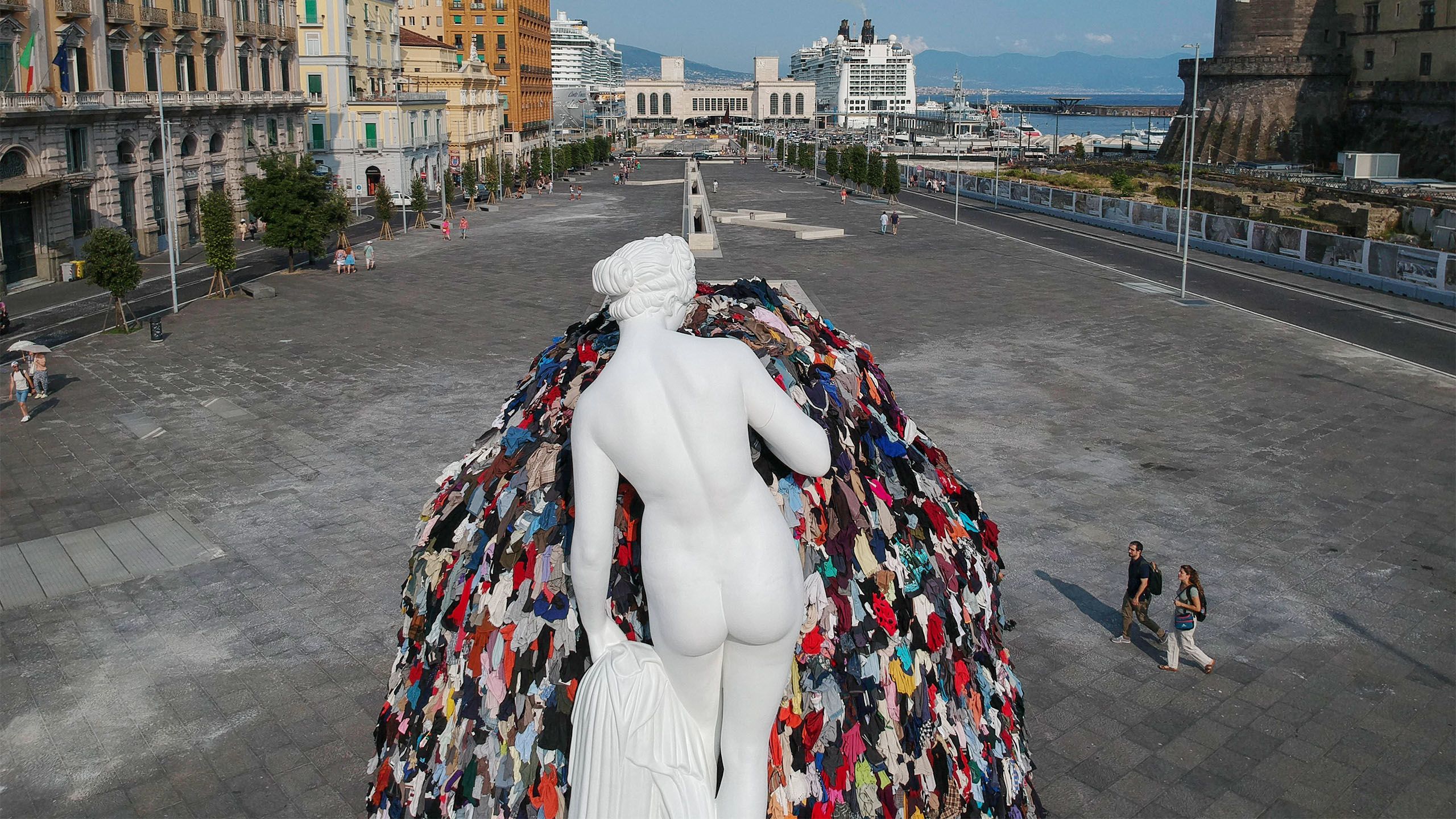 Die Statue am Hafen von Neapel scheint kein Interesse an den Gebäuden oder am Kreuzfahrt-Terminal zu haben, sondern den Berg von Textilien vor sich zu betrachten. Die den Statuen der Antike nachempfundene Figur und die Fetzen sind nicht zufällig so angeordnet, sie gehören zusammen. Es ist eine monumentale Version der "Venus der Lumpen". Der Künstler Michelangelo Pistoletto hat dieses Werk in den 1960er-Jahren konzipiert. Seine Venus wurde zu einer Ikone der Kunstrichtung Arte Povera und ist seit ihrer Entstehung in vielen Museen – in kleineren Versionen – gezeigt worden. Die Arte Povera arbeitet mit alltäglichem "wertlosen" Material. Was das Werk des 90-jährigen Pistoletto mit seiner Kombination aus antiker Schönheit und den Überbleibseln der Konsumgesellschaft bedeutet, ist schwer zu sagen.