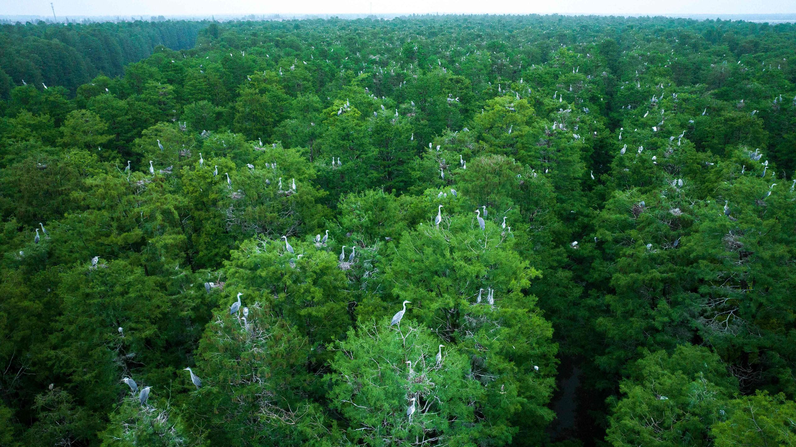 Und wieder einmal macht es die Natur bzw. die Tierwelt exemplarisch vor: Reiher – bis zum Horizont und in friedlicher Koexistenz. Die unzähligen Vögel halten sich im Qin-Lake-Park am Rand von Taizhou in Chinas östlicher Provinz Jiangsu auf und scheinen dort in dem Baldachin aus ineinandergreifenden Baumkronen relativ ungestört zu sein. Im Areal gib es noch Dutzende andere Vogelarten: Platz für alle, wenn man sich nur bescheidet, Natur als schlüssiges System.