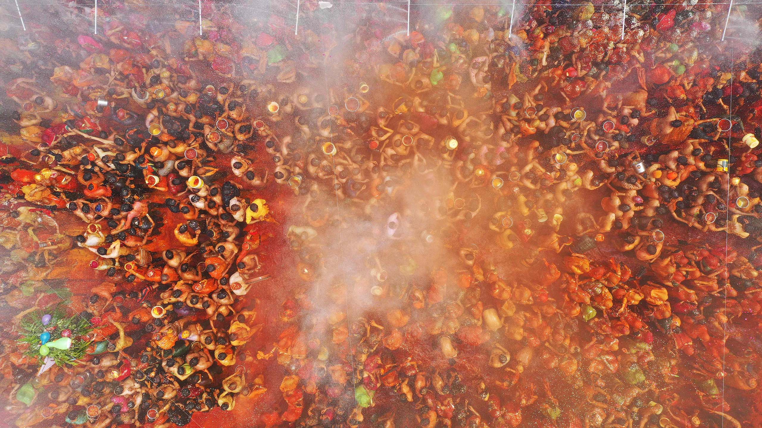 Das bunte Spektakel wurde auch im Dorf Baldeo im Bundesstaat Uttar Pradesh gefeiert. Die 3558 Jahre alte Tempelanlage dort zählt zu einem der Zentren des Kults rund um Holi. Das Foto zeigt eine im blutorangenem Wasser watende Menge, die sich gegenseitig immer neue Farbschichten auflegt: wie in einem surrealen Technicolor-Traum, vermutlich befeuert von Bhang, einem Hanfgetränk, nach dessen Konsum Sie in keine europäische Polizeikontrolle kommen möchten. Wasser und Farbe werden zum Klebstoff der Gesellschaft, zu etwas, was Leute zusammenbringt und im positiven Sinn gemeinmacht. Angeblich zählt zu Holi keine Kaste, es ist eine zeitweilige Entgrenzung in einem Land, das von gesellschaftlichen Grenzen sonst schlechterdings besessen ist.