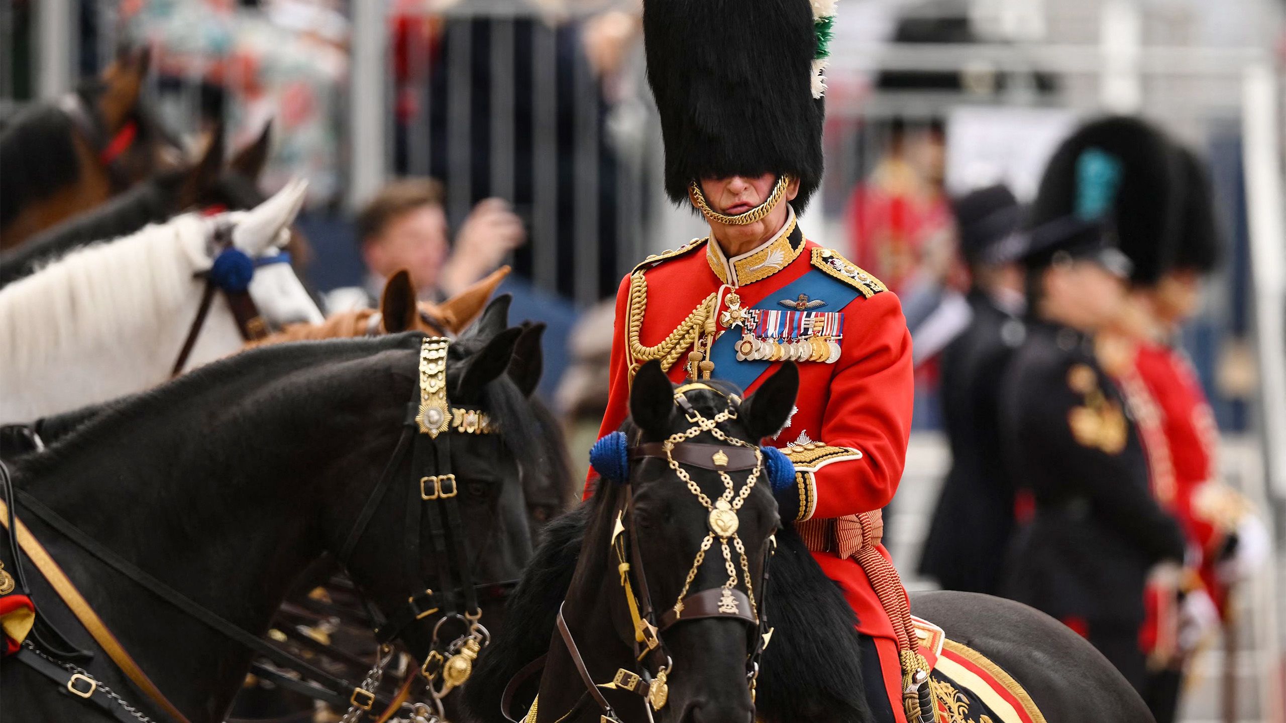 "Trooping the Colour", erstmals im 17. Jahrhundert unter Karl II. von England durchgeführt, bedeutet sinngemäß "Die Farben der Fahne den Truppen" zeigen. Der Ursprung der Zeremonie liegt im Brauch des täglichen Vorführens der Truppenfahnen vor den Soldaten, damit sie diese später im Kampf wiedererkennen konnten. Diese enge Bindung an die Fahne war nötig, um im Durcheinander historischer Schlachtfelder einen festen Orientierungspunkt zu haben. Der Gesichtsausdruck von Charles könnte auch etwas mit dem Ding auf seinem königlichen Haupt zu tun haben. Die klassische Bärenfellmütze ist mehr als einen halben Meter hoch, wiegt rund sieben Kilo und wird – trotz Protests von Tierschützern – noch immer aus dem Fell von kanadischen Braunbären hergestellt.