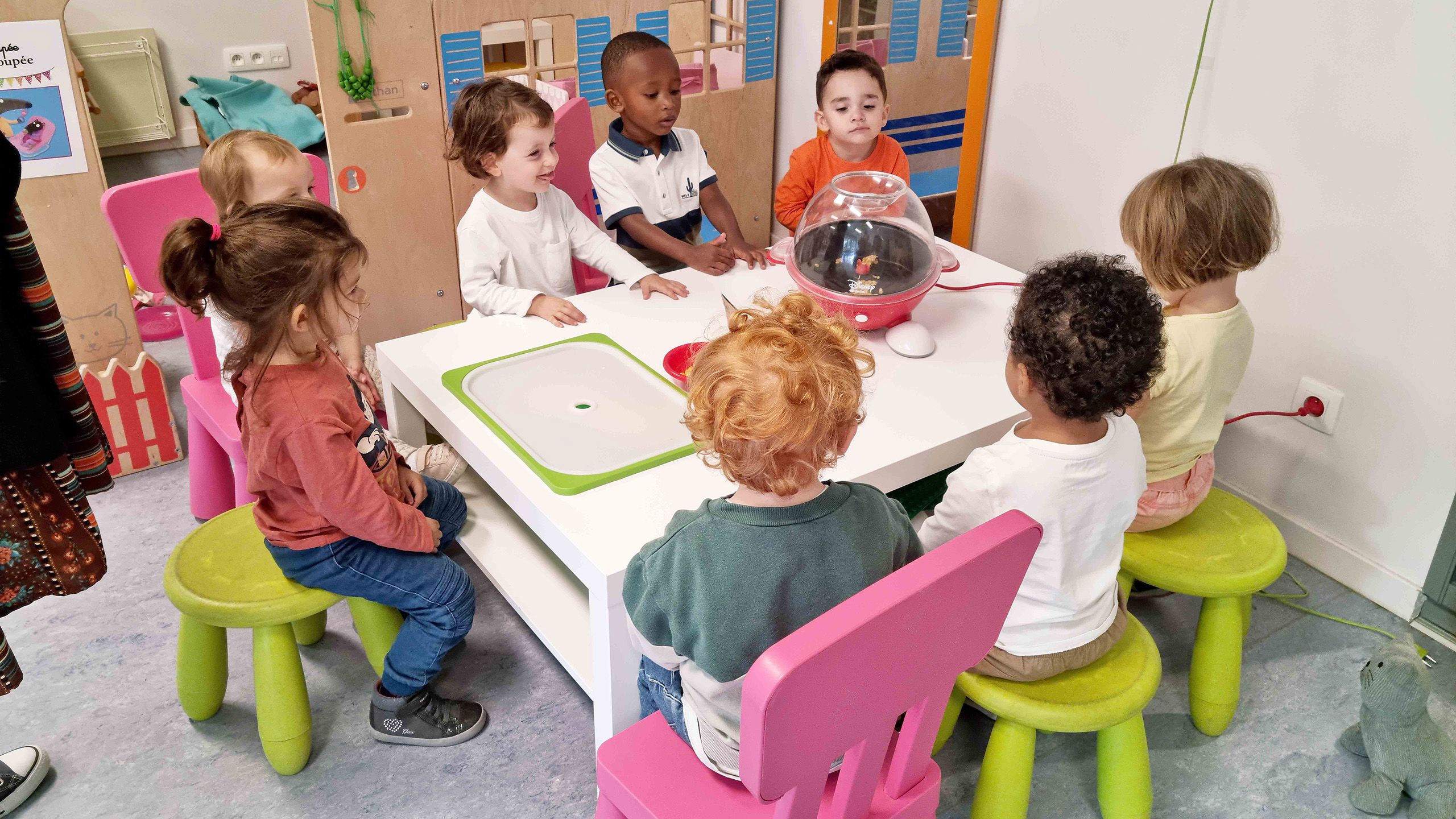 In der Klasse von Madame Barbara ist die Vokabel-Zeit vorbei, jetzt zeigt die Pädagogin den Kindern an dem winzigen Tisch mit einer kleinen Maschine, wie aus Mais Popcorn wird. Sie erklärt, dass Wärme dabei eine Rolle spielt. Krachend kauen die Kleinen. „Ist das salzig oder süß, Colette?“ Die Zweijährige ist sich nicht ganz sicher, zusammen mit Madame Barbara ist die Antwort aber schnell gefunden. „Salzig!“