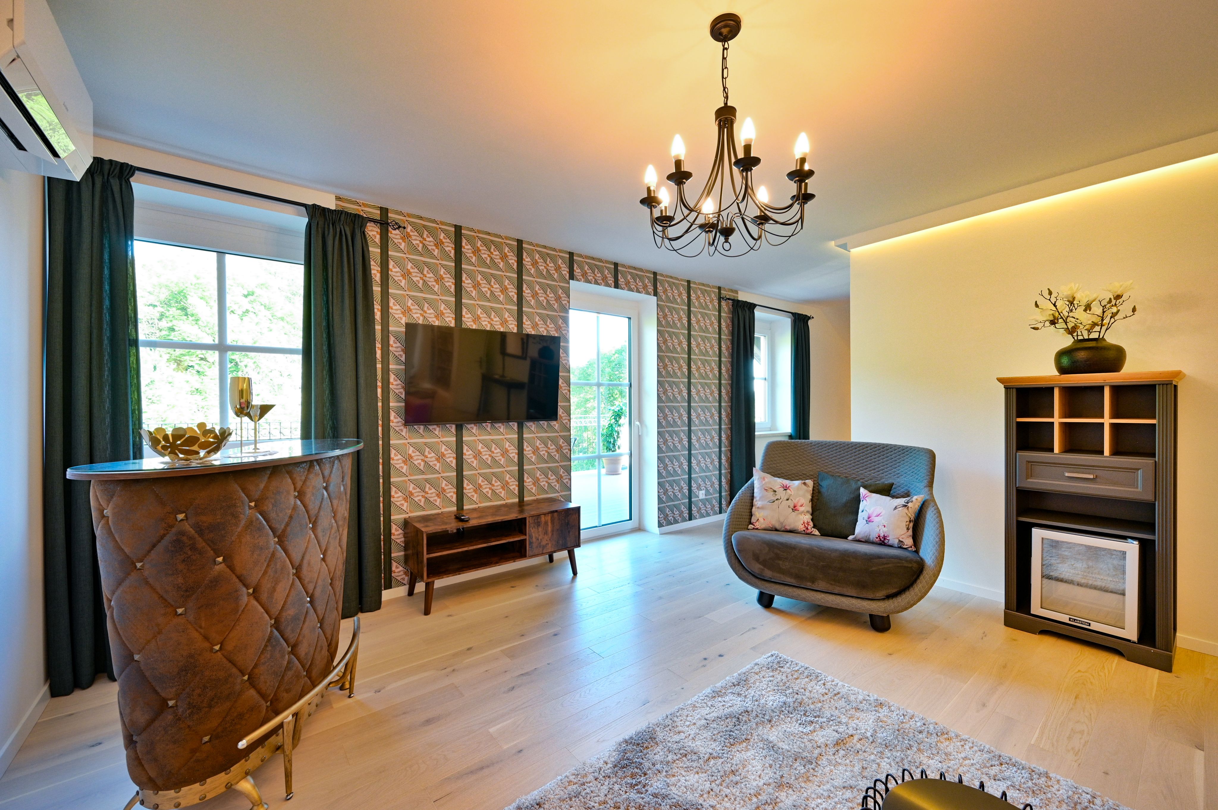 Jede Suite ist mit allem ausgestattet, was Ihren Aufenthalt besonders angenehm macht: Klimaanlage, Sat-TV, WLAN, Safe, Föhn, Minibar und Gästepantoffeln gehören ebenso zur Grundausstattung wie ein vom Bad getrenntes WC – für zusätzlichen Komfort und Privatsphäre. Unsere hochwertigen Luxusbetten mit erstklassigem Liegekomfort sorgen dafür, dass Sie tief schlafen und vollkommen erholt in den neuen Tag starten. In vielen Suiten erwartet Sie außerdem eine originelle Bar, die dazu inspiriert, sich ein gutes Glas zu gönnen und den Moment zu genießen. Wein, Prosecco und verschiedene Getränke stehen Ihnen rund um die Uhr im Frühstücksbereich zur Selbstbedienung bereit. Auf den Balkonen und großzügigen Terrassen laden bequeme Möbel zum Verweilen ein. Genießen Sie die Ruhe, die Weite und den herrlichen Blick in die umliegende Landschaft – ein Ort, an dem Entspannung ganz von selbst entsteht.