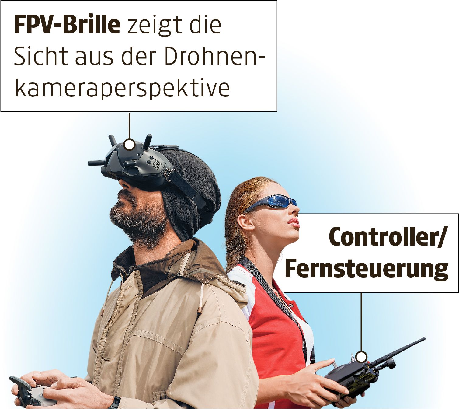Drohnen können u. a. manuell über Fernbedienung (Joysticks), Apps auf Handys und Computern, automatisiert mit Vorprogrammierung oder autonom mit KI-Systemen gesteuert werden. FPV-Drohen („First-Person-View“) werden vom Piloten aus der „Ich-Perspektive“ mithilfe spezieller Brillen, die das Live-Video der Kamera anzeigen, manövriert.