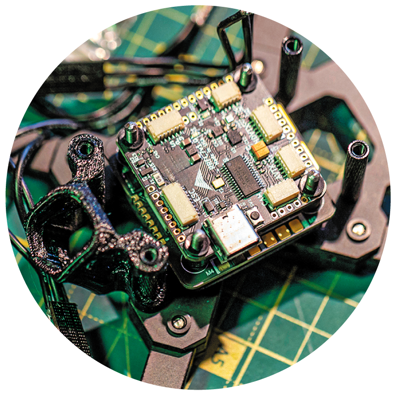 Das „Drohnengehirn“ steuert die Drohne auf Basis der Pilotenbefehle und der Daten der eingebauten Sensoren wie z. B. Barometer, GPS-Modul, Drehraten-, Beschleunigungssensor oder Kompass.