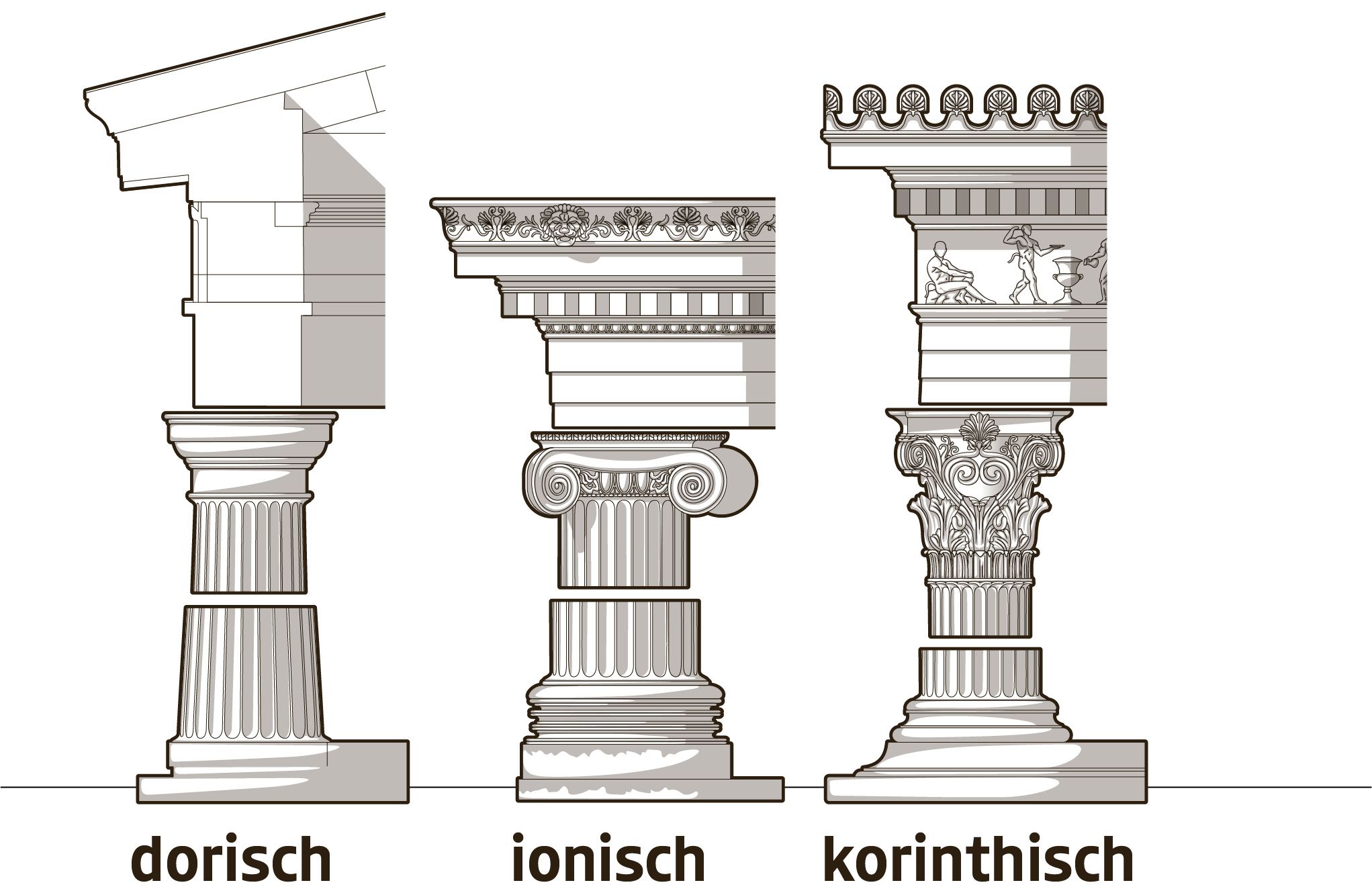 Insgesamt gibt es in der antiken Architektur (griechische und römische Architektur) fünf Säulenordnungen. Dorische, ionische, korinthische, toskanische und komposite Ordnung, wobei die toskanische und komposite Ordnung Abwandlungen bzw. Mischformen von der griechischen Säulenordnung sind.