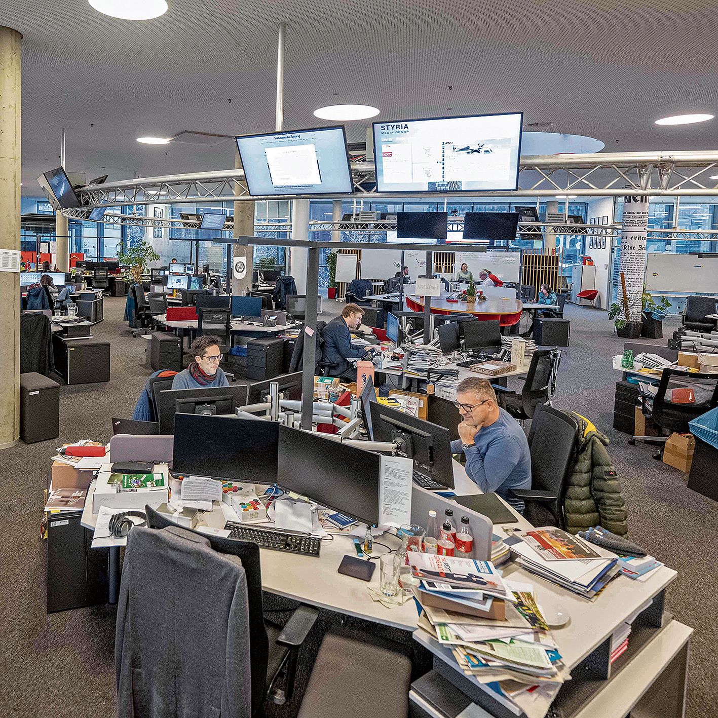Mit errechneten 1347 Tonnen CO2 entfallen weniger als 7 Prozent der jährlichen Emissionen auf die Redaktion und die kaufmännischen Bereiche. Mildernd wirkt, dass viele Besprechungen inzwischen digital stattfinden. Für Mitarbeiterinnen und Mitarbeiter gibt es Zuschüsse zum Klimaticket, die meisten Dienstwagen sind auf E-Antrieb umgestellt.