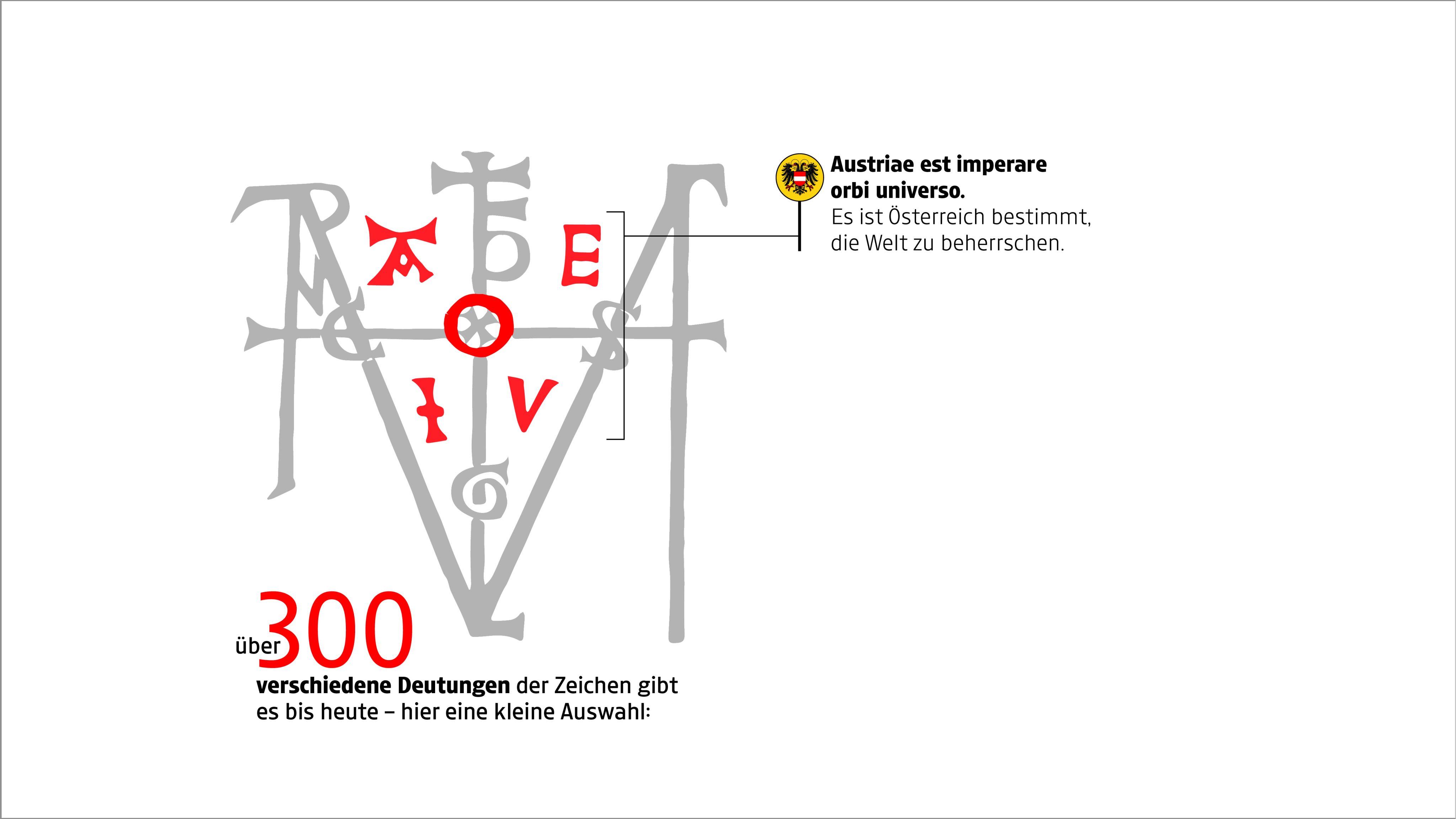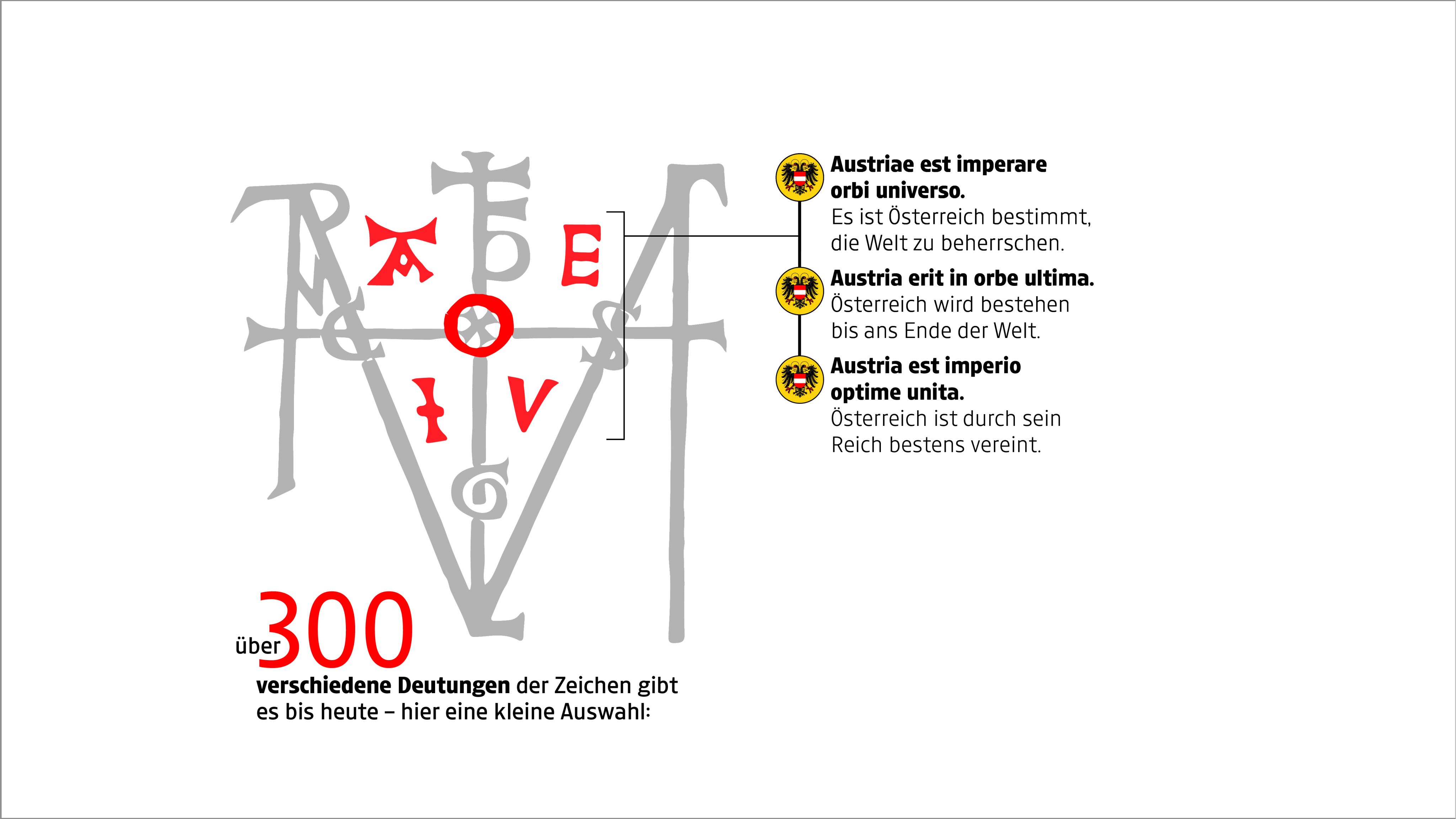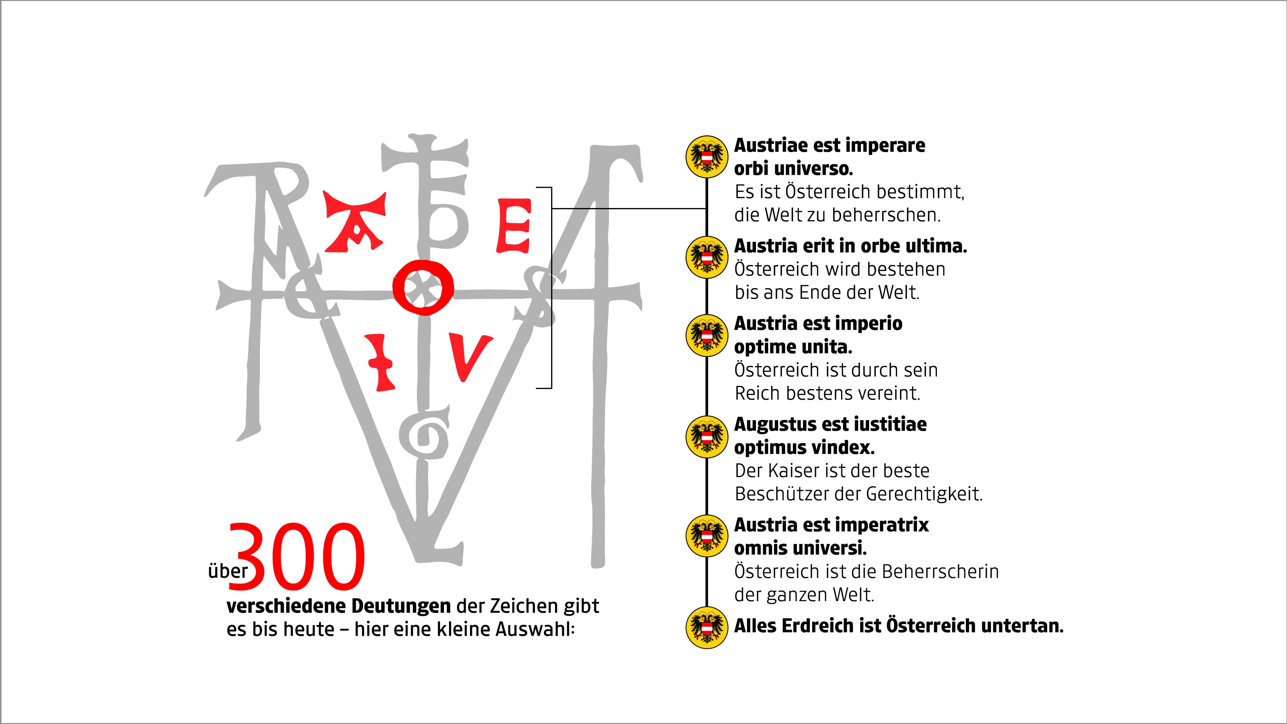 Doch was bedeutet sie? Darüber gab es bislang unzählige Vermutungen. Von "Austriae est imperare orbi universo" (Es ist Österreich bestimmt, die Welt zu beherrschen) bis "Aller erst ist Österreich verloren" – ein Wahlspruch der Wiener während der Besetzung Wiens durch Corvinus (1485).