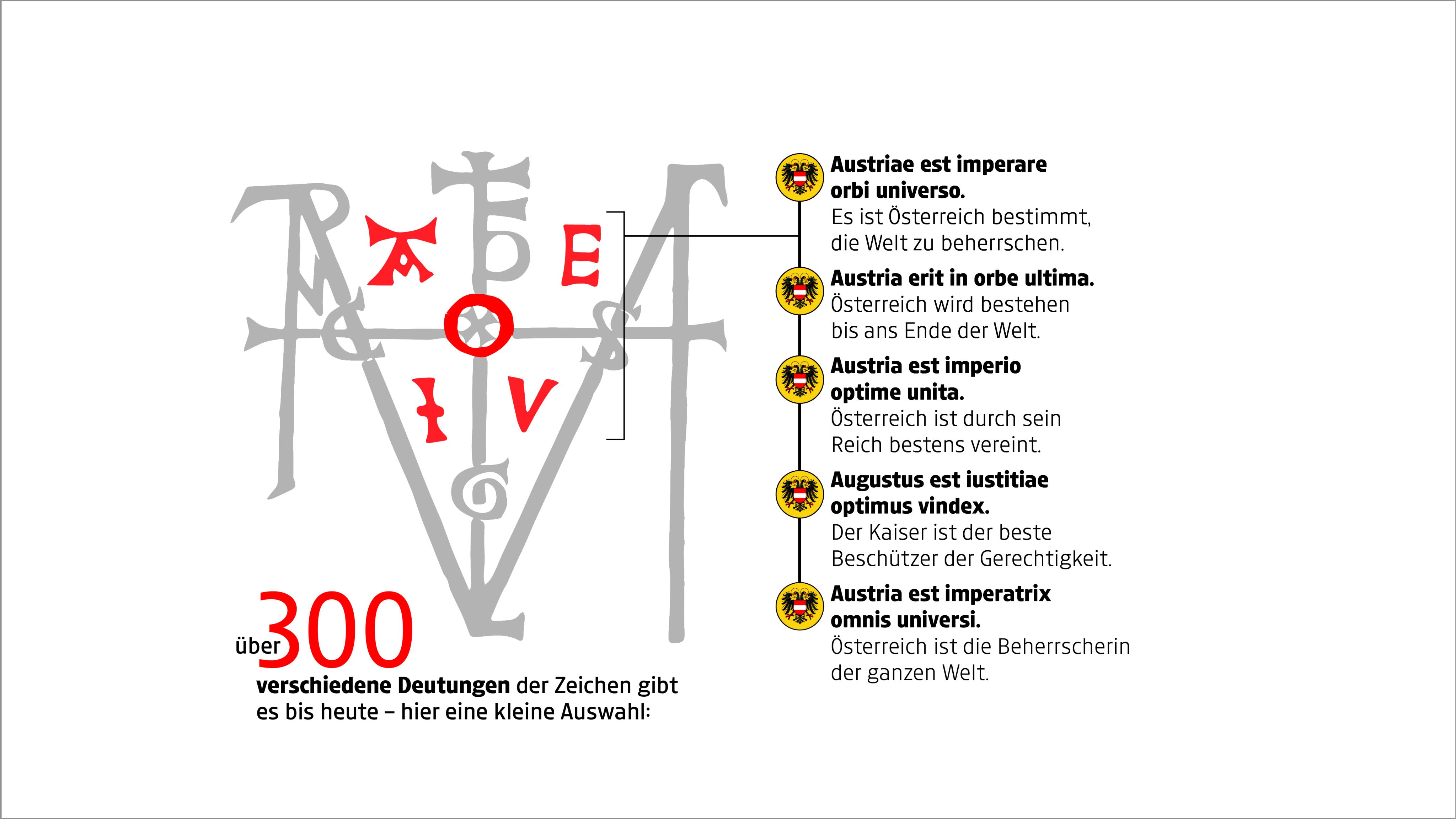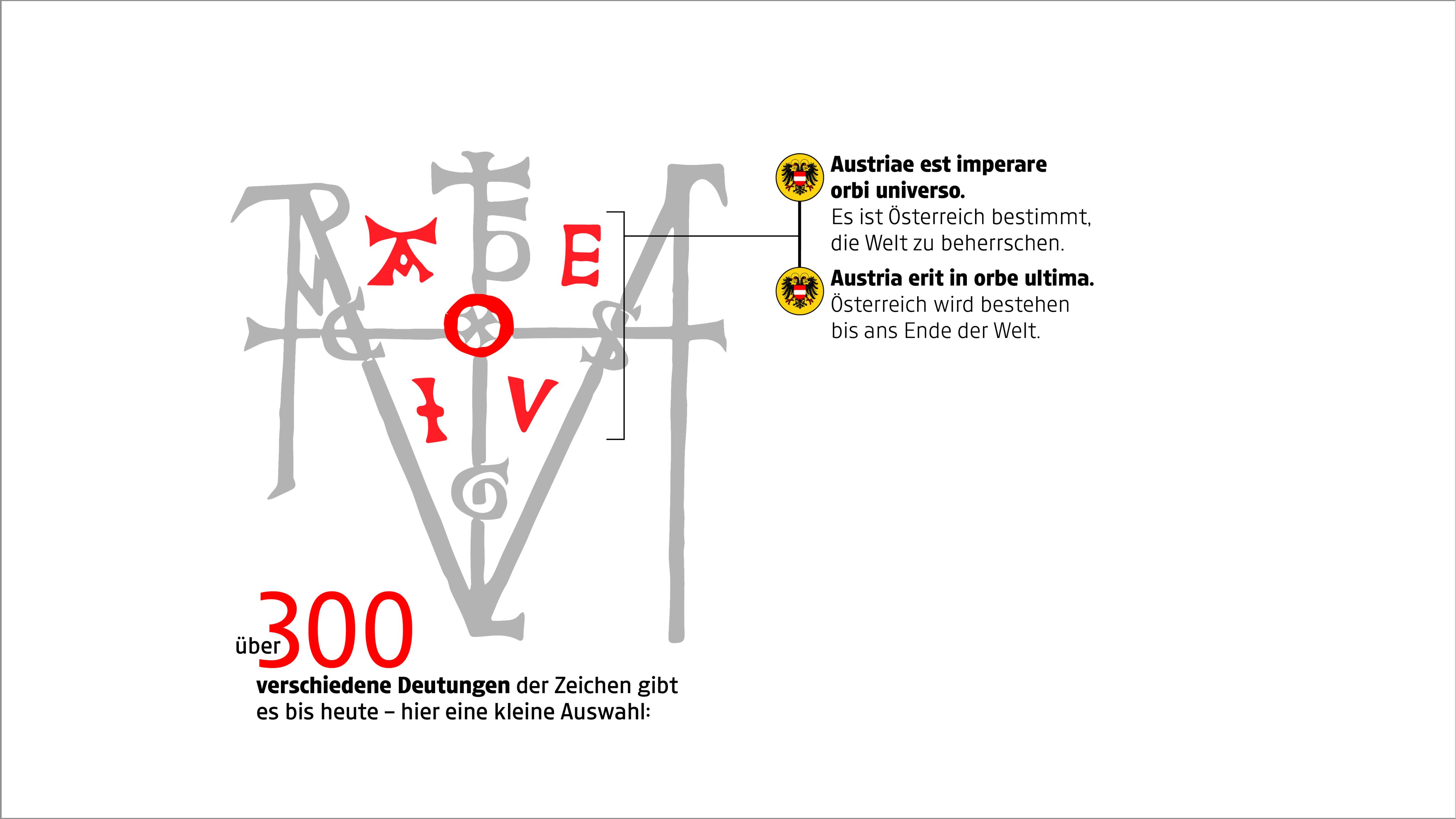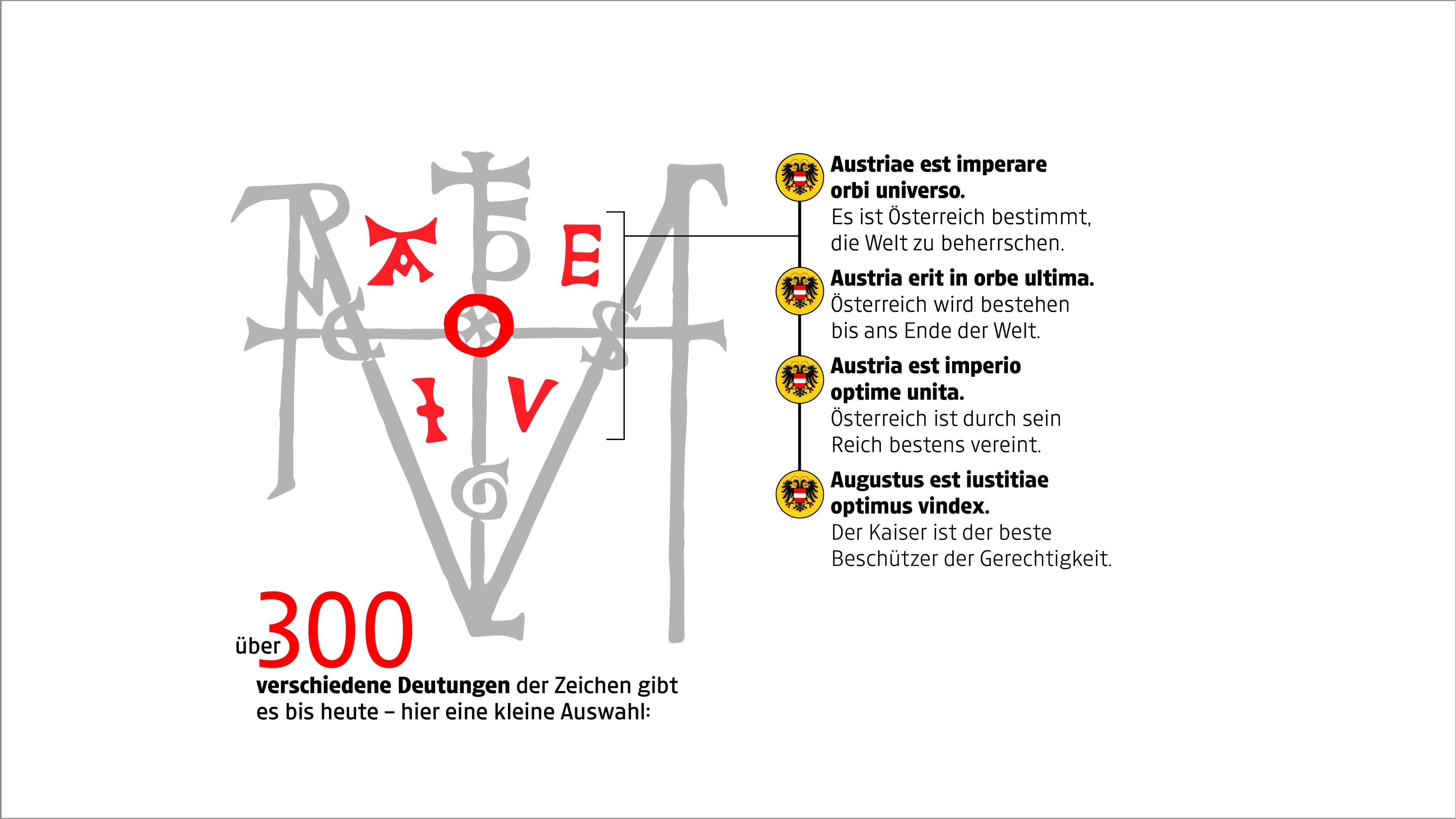 Doch was bedeutet sie? Darüber gab es bislang unzählige Vermutungen. Von "Austriae est imperare orbi universo" (Es ist Österreich bestimmt, die Welt zu beherrschen) bis "Aller erst ist Österreich verloren" – ein Wahlspruch der Wiener während der Besetzung Wiens durch Corvinus (1485).