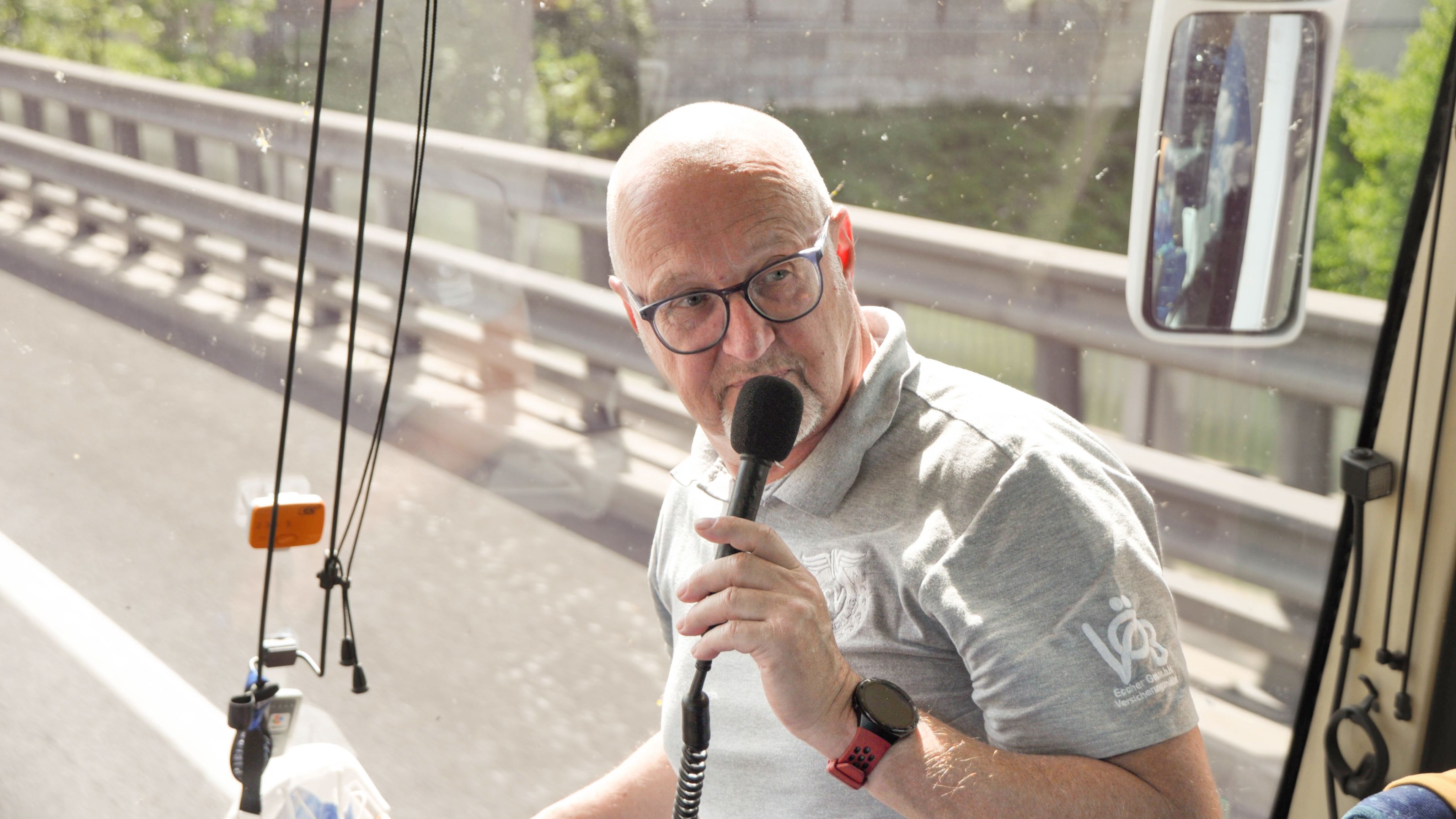 Derweil ergreift Hähnel die Chance, um Spieler und Schlachtenbummler über das rauschende Busmikro zu begrüßen. Von den hinteren Reihen wird darauf lautstark sein Name skandiert.