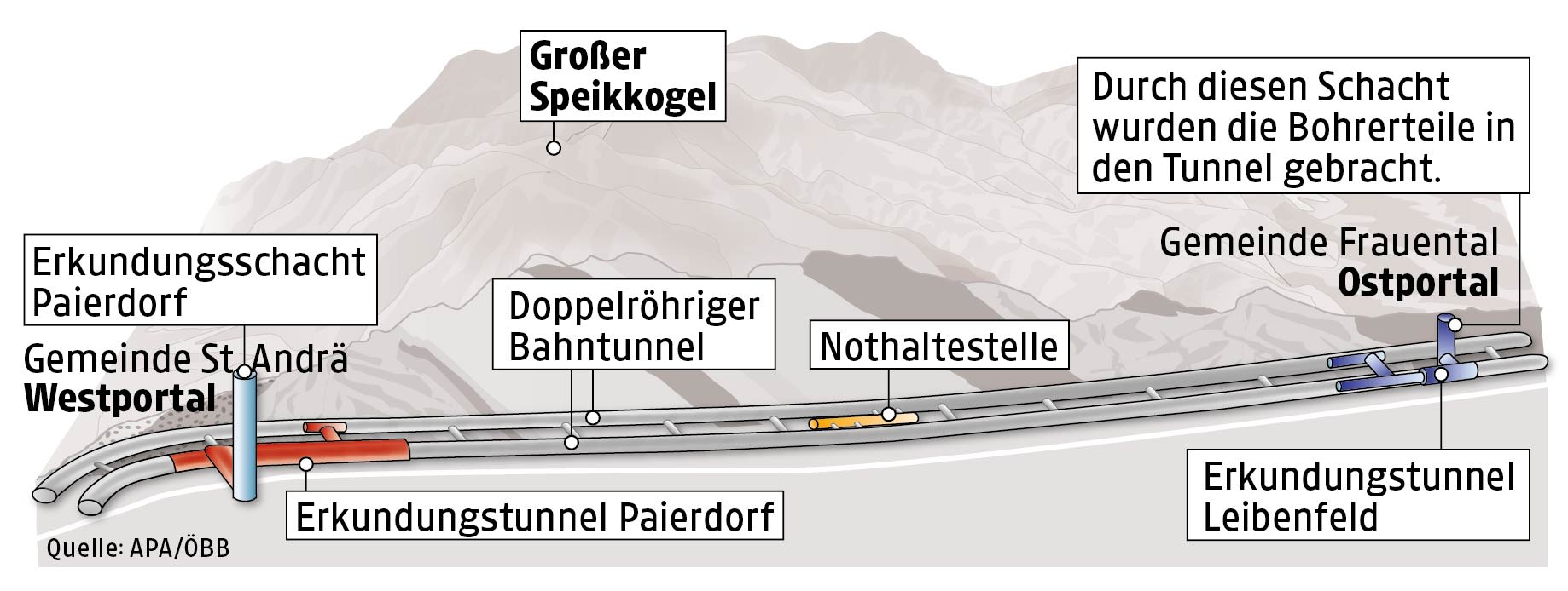 Er ist das Herzstück der Koralmbahn: Der 32,9 Kilometer lange Koralmtunnel besteht aus zwei eingleisigen Röhren mit einem Durchmesser von je zehn Metern, die in einem Abstand von 25 bis 50 Metern nebeneinander durch das Gestein der Koralpe geschlagen wurden. Zum Einsatz kamen dabei drei Tunnelbohrmaschinen, die selbst eine Länge von rund 200 Metern und einen Durchmesser von zehn Metern haben. Der Tunnel führt vom Ostportal bei Deutschlandsberg (konkret im Gemeindegebiet von Frauental an der Laßnitz) durch den Gebirgszug zum Westportal, das gerade noch in der Gemeinde St. Andrä, aber unmittelbar neben dem Bahnhof St. Paul im Lavanttal, liegt.