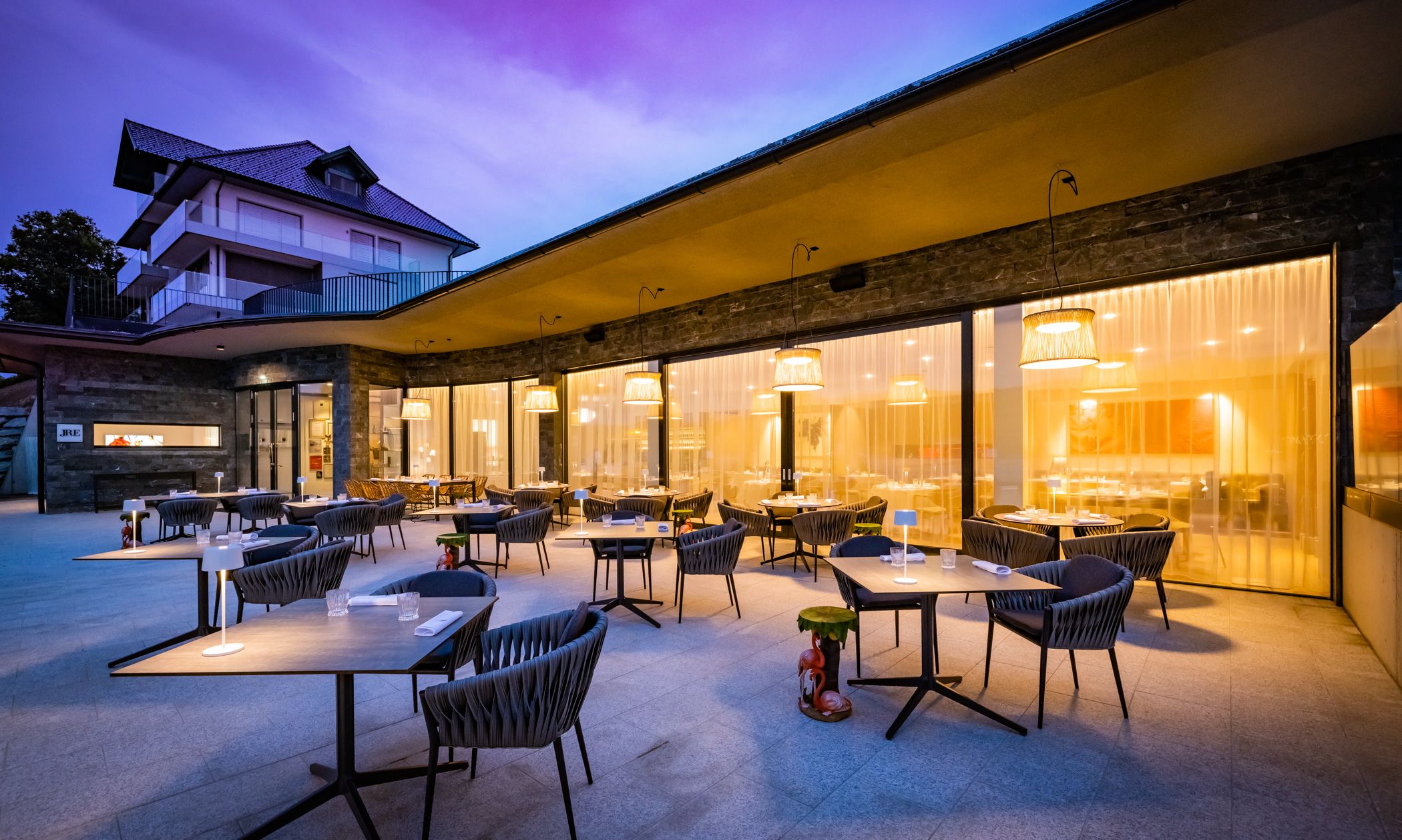Stilvoll und elegant ist das La Terrasse, eine der angesagten Fine-Dining-Locations in Kärnten. Im Restaurant schaffen die Farben Bordeaux, Chamois, Pink und Terrakotta eine zurückhaltende Eleganz und überlassen einem ganz besonderen Schmuckstück die volle Aufmerksamkeit, dem Weinklimaraum mit 700 Flaschen Rotwein, Weißwein und Champagner.