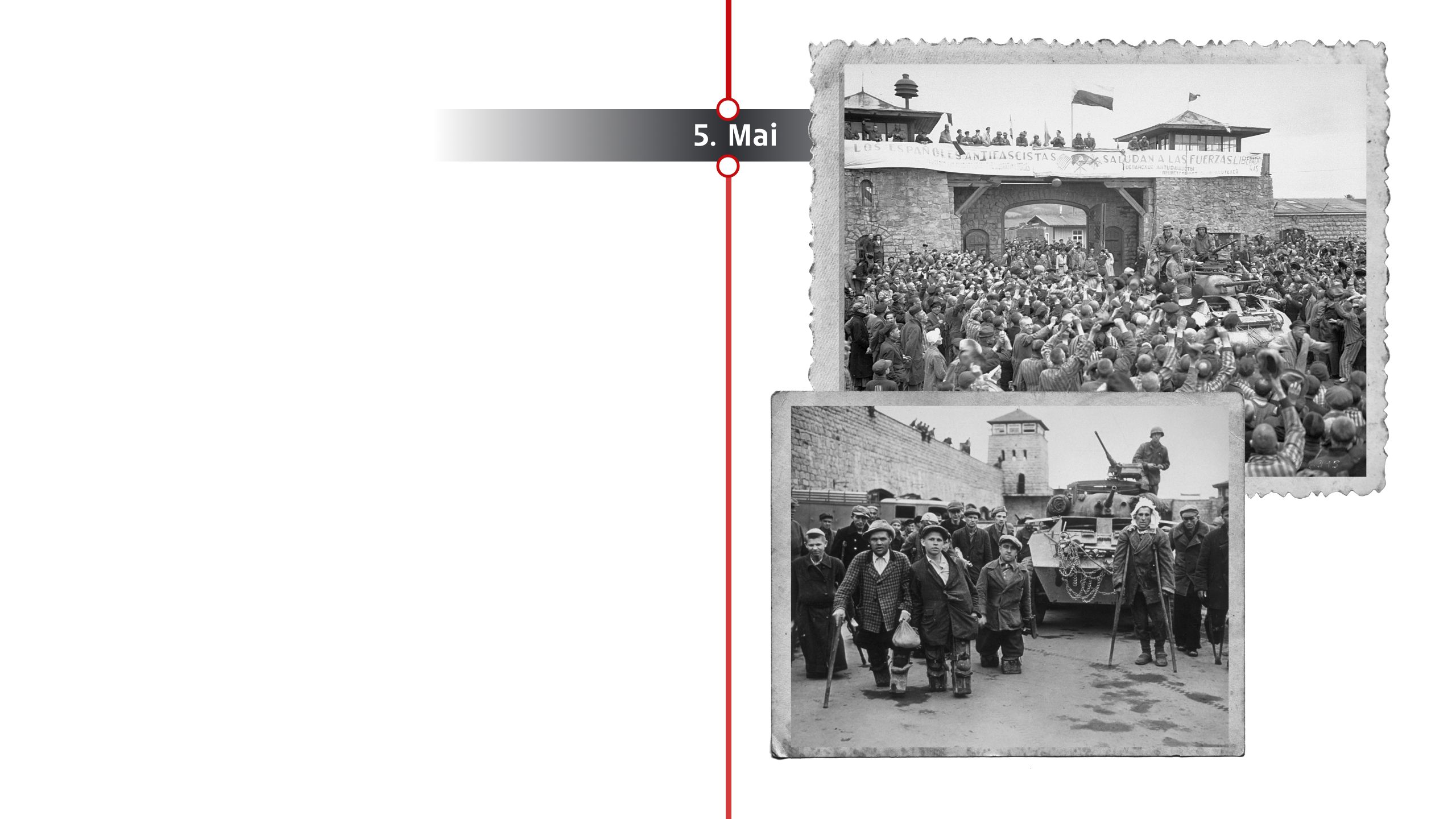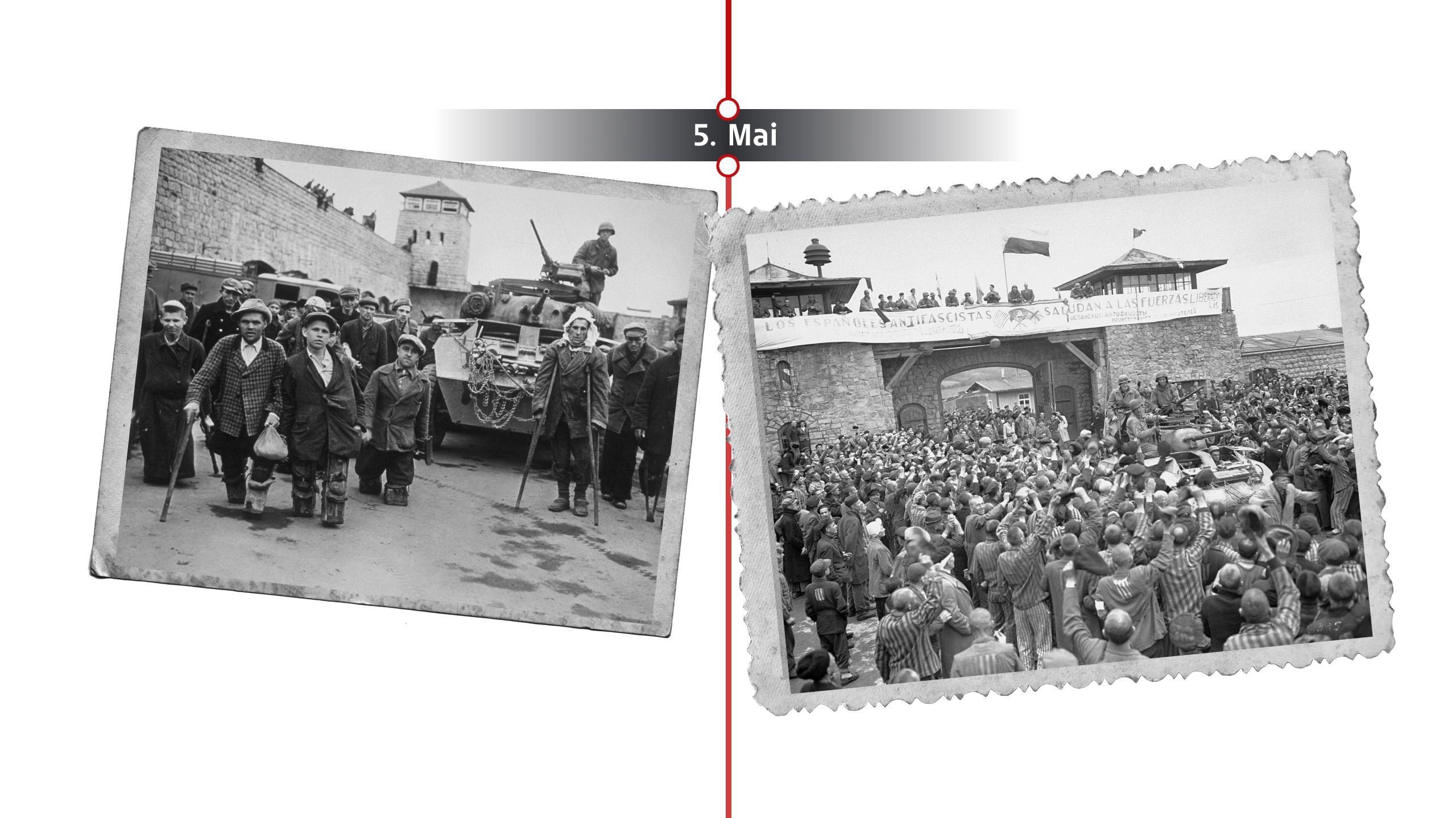 Am 5. Mai 1945 erreichen US-Truppen der 11. Panzerdivision das Konzentrationslager Mauthausen/Gusen in Oberösterreich. Rund 40.000 Häftlinge, stark geschwächt und vielfach dem Tod nahe, erleben die Befreiung. Viele SS-Wachen hatten das Lager kurz zuvor verlassen.