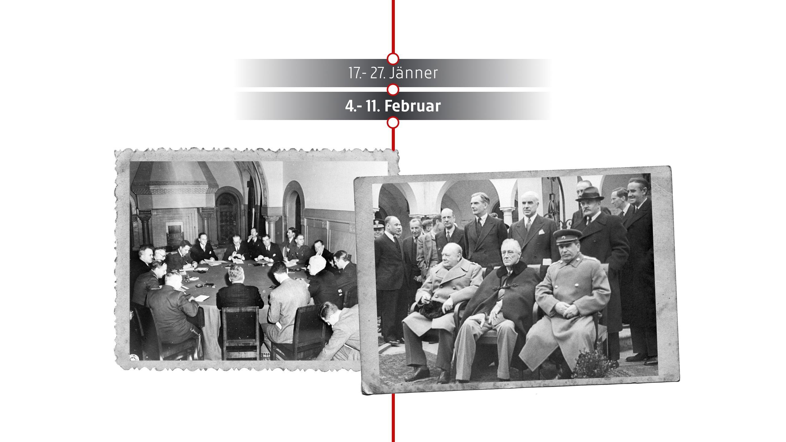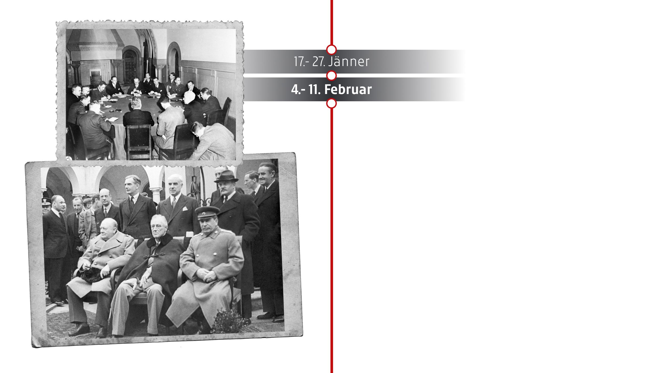 Die „Großen Drei“ – Stalin (UdSSR), Roosevelt (USA) und Churchill (Großbritannien) – treffen sich in Jalta auf der Krim, um die Nachkriegsordnung zu besprechen. Wichtige Beschlüsse: