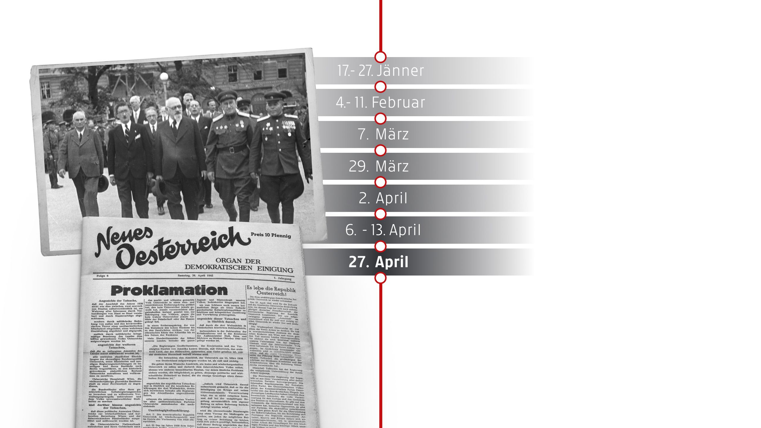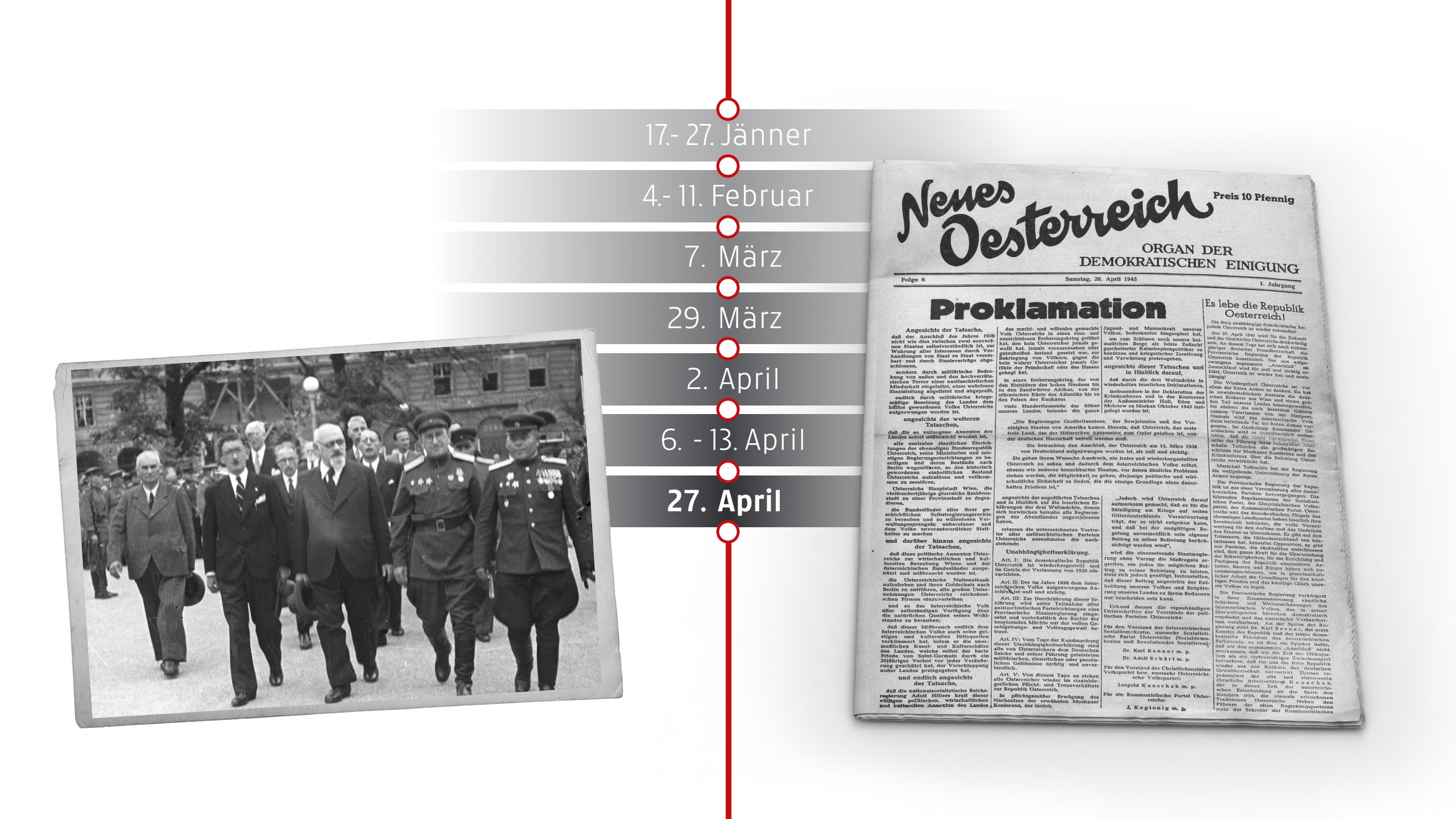 In Wien ruft eine provisorische Regierung unter Karl Renner die Unabhängigkeit Österreichs aus. Mit der Unabhängigkeitserklärung wird der Anschluss von 1938 für „null und nichtig“ erklärt. Österreich erklärt sich zum demokratischen und unabhängigen Staat, basierend auf der Verfassung von 1920.