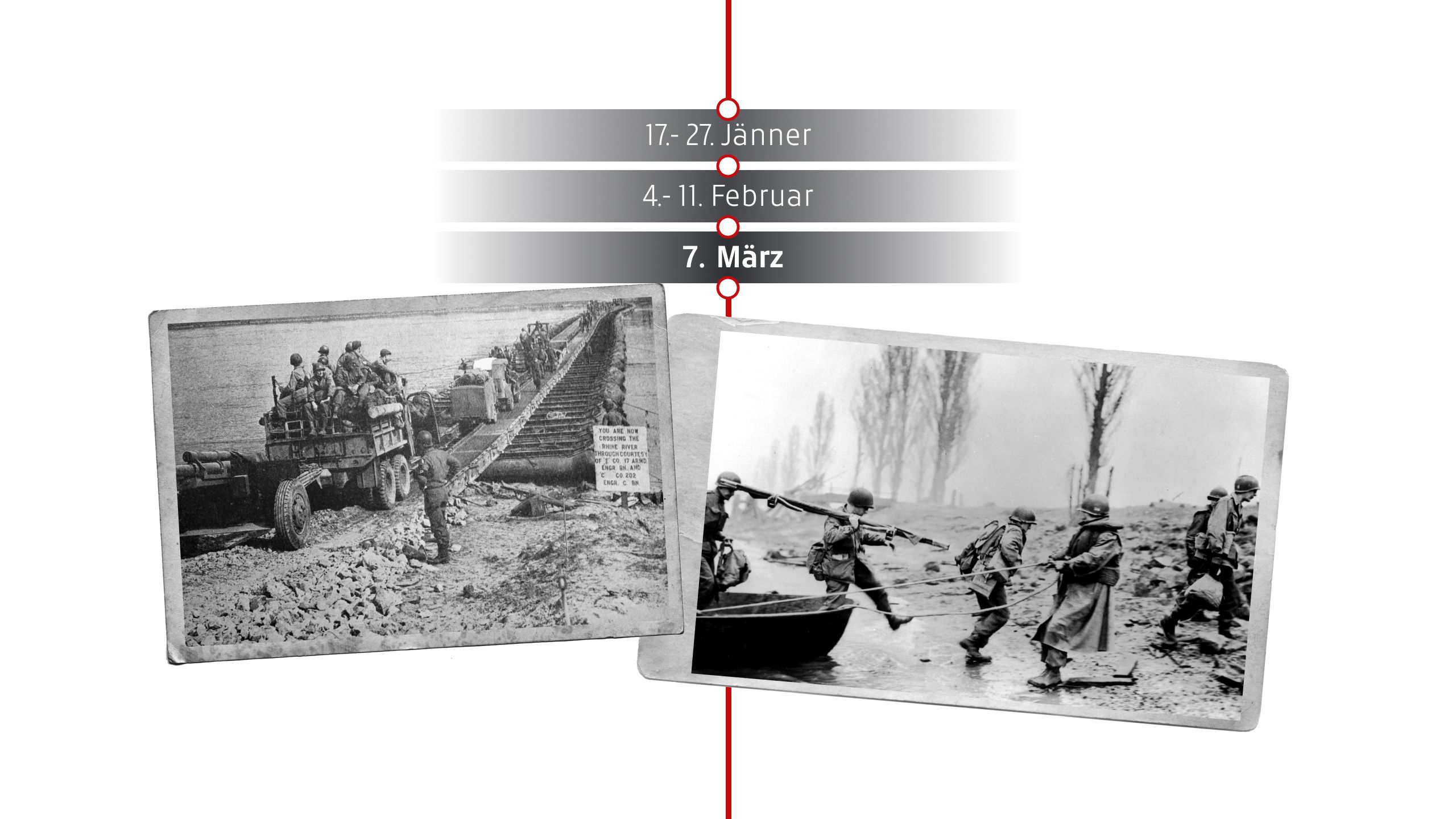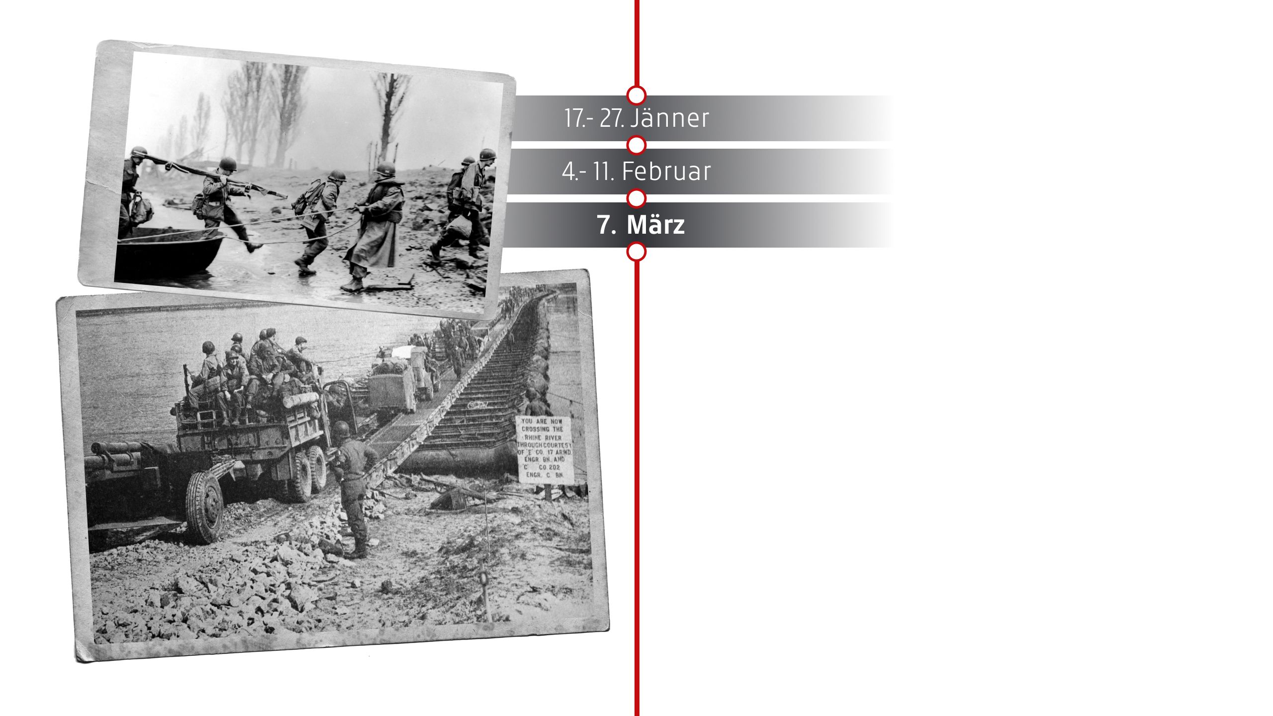 US-Truppen der 1. US-Armee erreichen die Ludendorff-Brücke bei Remagen und stellen überrascht fest, dass sie noch intakt ist. Trotz deutscher Sprengversuche gelingt es den Amerikanern, die Brücke zu erobern und einen Brückenkopf am Ostufer des Rheins zu errichten. Dies beschleunigt den Vormarsch der Alliierten ins Deutsche Reich erheblich. Hitler tobt und befiehlt drakonische Strafen für die verantwortlichen deutschen Offiziere. Die Brücke stürzt zwar am 17. März ein, doch bis dahin haben die Amerikaner bereits eine stabile Rheinüberquerung geschaffen.
