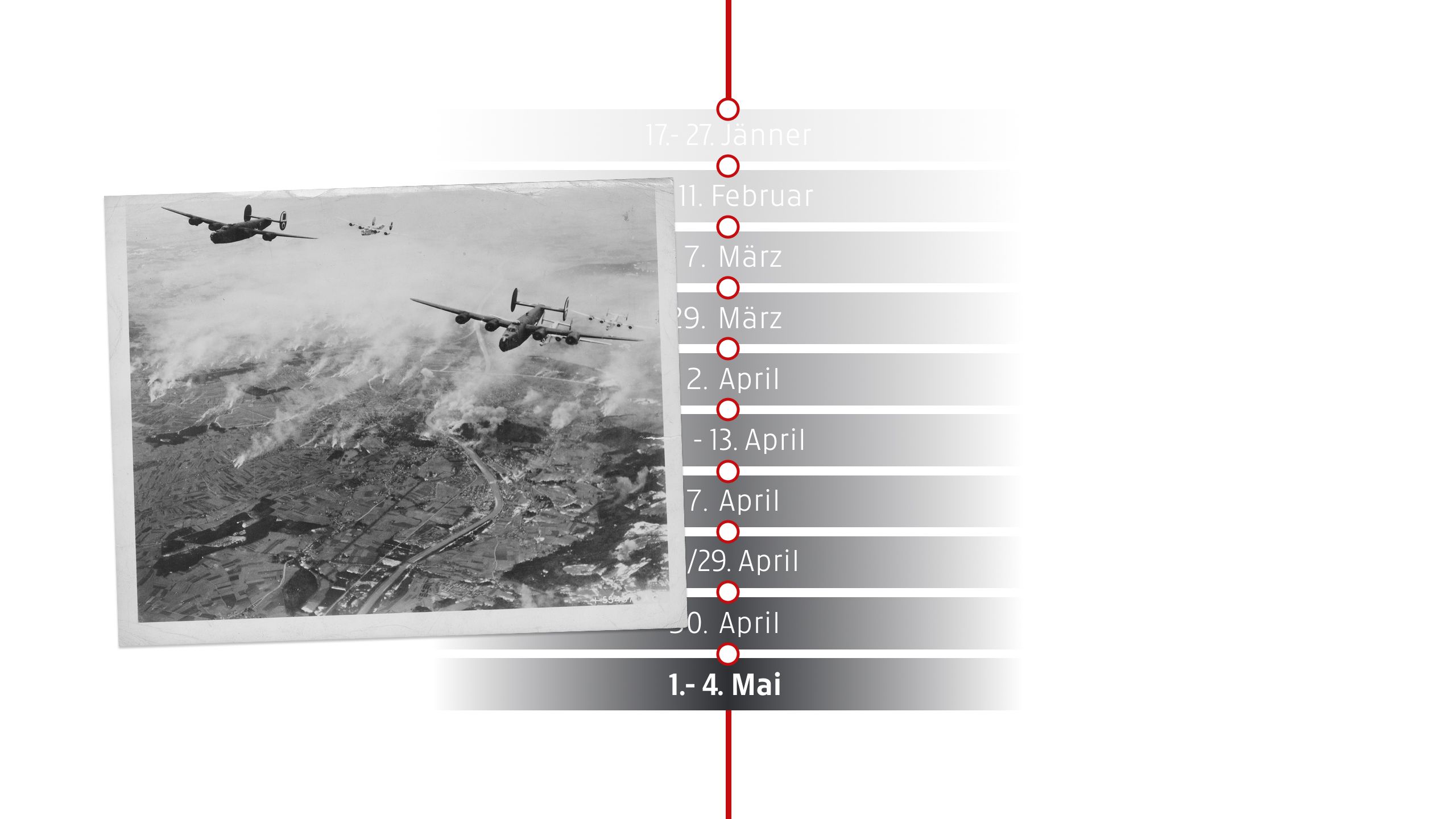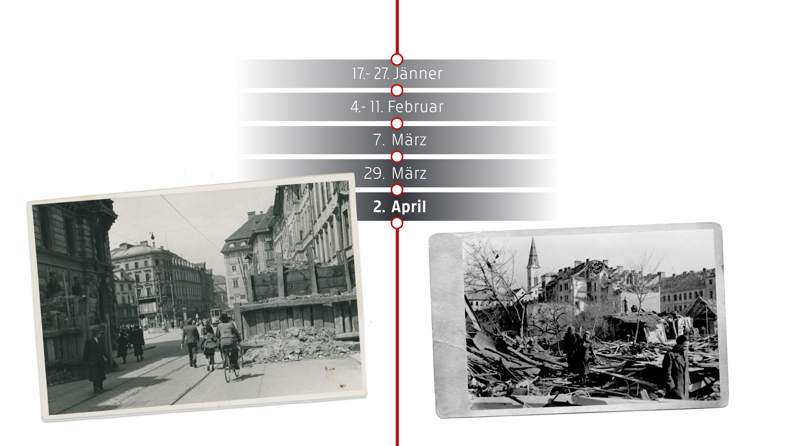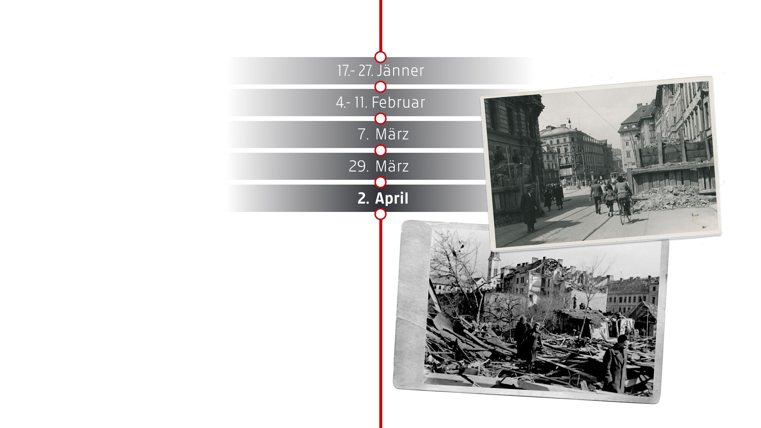 Die US-Luftstreitkräfte fliegen einen der verheerendsten Luftangriffe auf Graz. Vor allem Bahnanlagen, Industriegebiete und militärische Ziele werden bombardiert. Große Teile der Stadt werden schwer beschädigt, zahlreiche Zivilisten sterben. Die Infrastruktur wird weiter zerstört, während sich die deutsche Wehrmacht auf die Verteidigung vorbereitet. Die Bevölkerung leidet unter den Folgen der Angriffe, Lebensmittelknappheit und der Angst vor der nahenden Front.