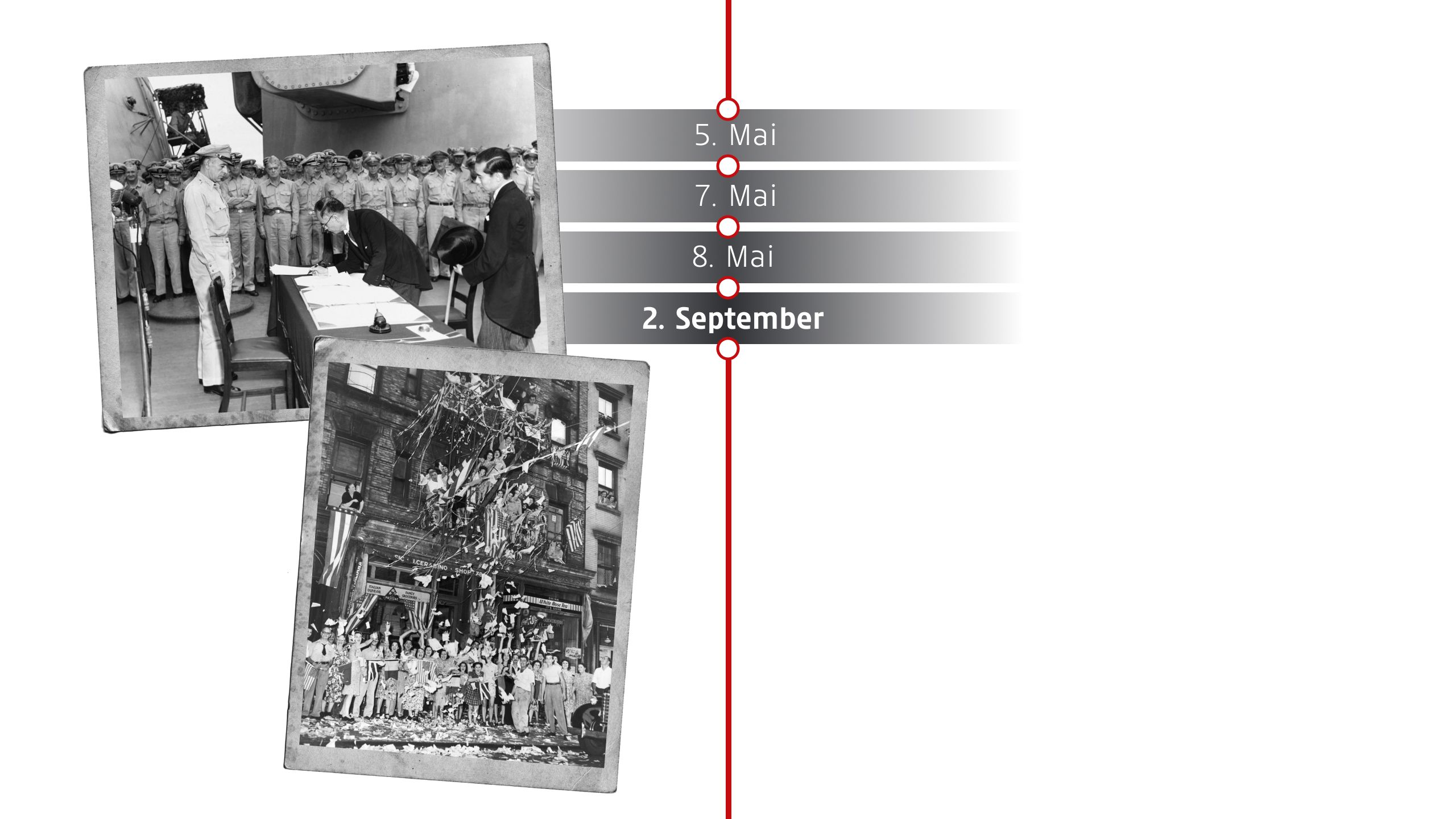 Am 2. September 1945 unterzeichnet Japan an Bord des US-Schlachtschiffs USS Missouri in der Bucht von Tokio die bedingungslose Kapitulation. Damit ist der Zweite Weltkrieg weltweit beendet.