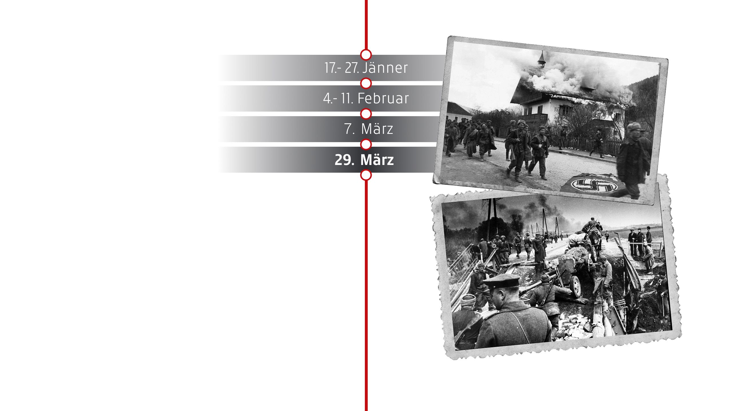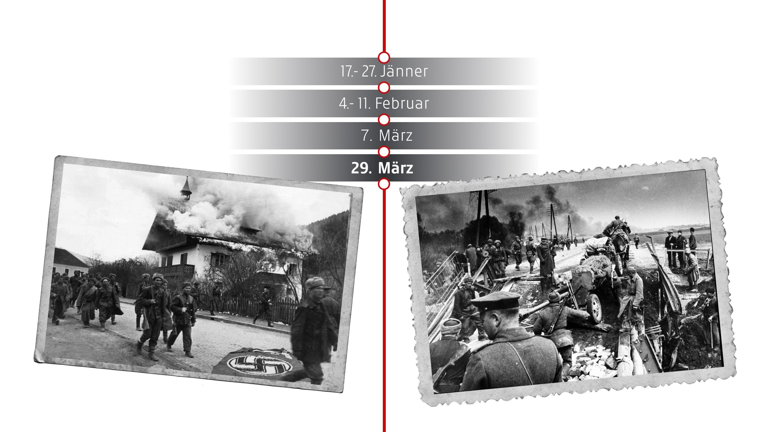 Die Rote Armee erreicht Österreich und überschreitet die Grenze im Burgenland bei Klostermarienberg. Dies markiert den Beginn der Wiener Offensive. Die Wehrmacht zieht sich zurück und hinterlässt zerstörte Brücken und Stellungen. In KZs wie Mauthausen eskaliert der Terror gegen Häftlinge. Die Zivilbevölkerung leidet unter Plünderungen, Luftangriffen und dem zunehmenden Chaos des Kriegsendes.
