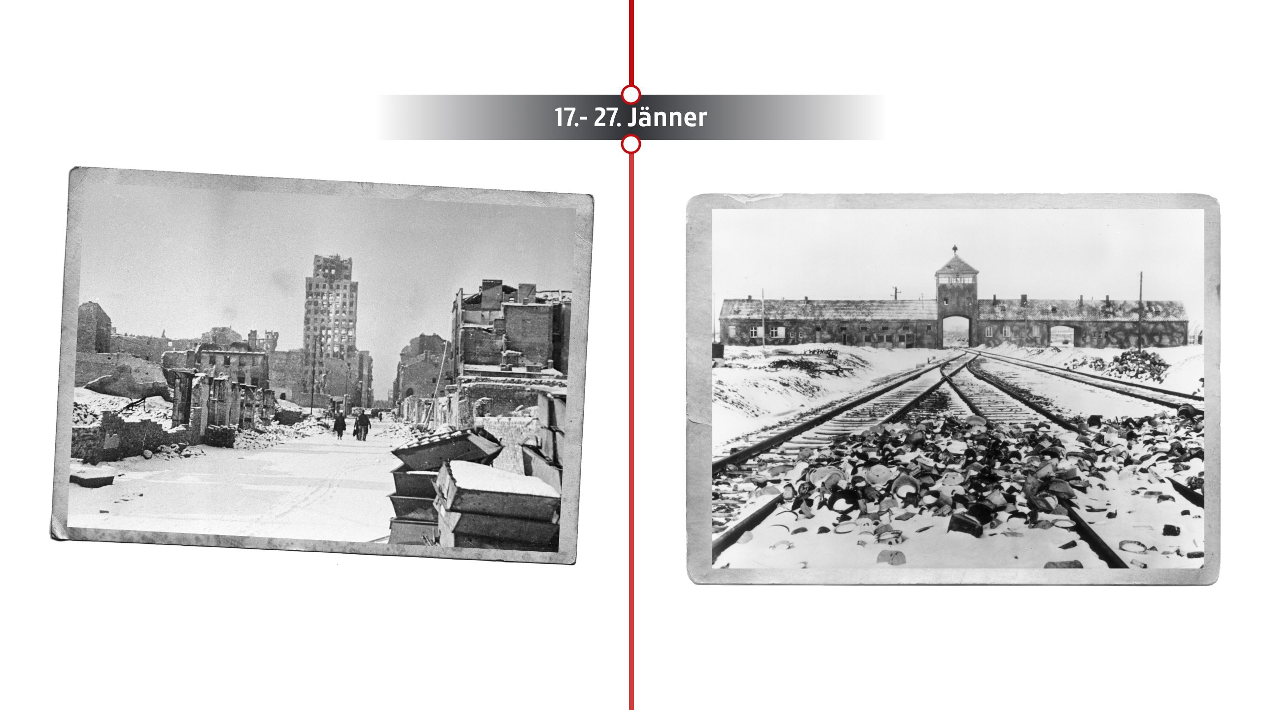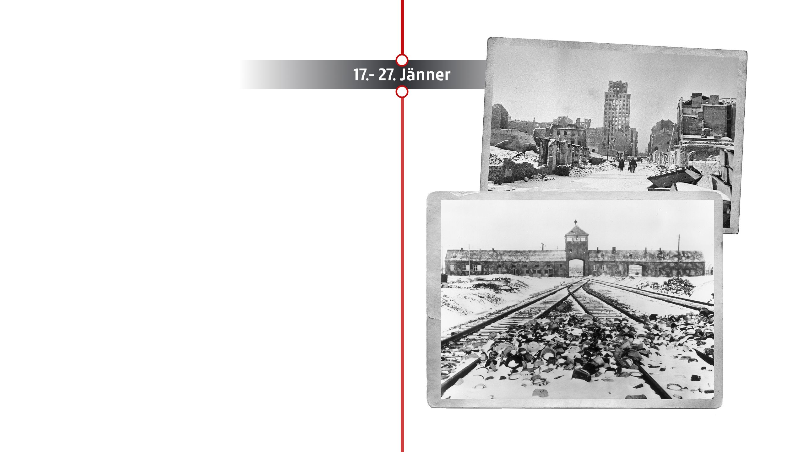 Die Rote Armee befreit das KZ Auschwitz. Rund 7.000 überlebende Häftlinge – schwer geschwächt – werden vorgefunden. Die Deutschen hatten zuvor die meisten Häftlinge auf Todesmärsche gezwungen. Die Befreiung offenbart das volle Ausmaß des Holocausts und macht Auschwitz zum Symbol der NS-Verbrechen. Der 27. Jänner wird später als Internationaler Holocaust-Gedenktag festgelegt.