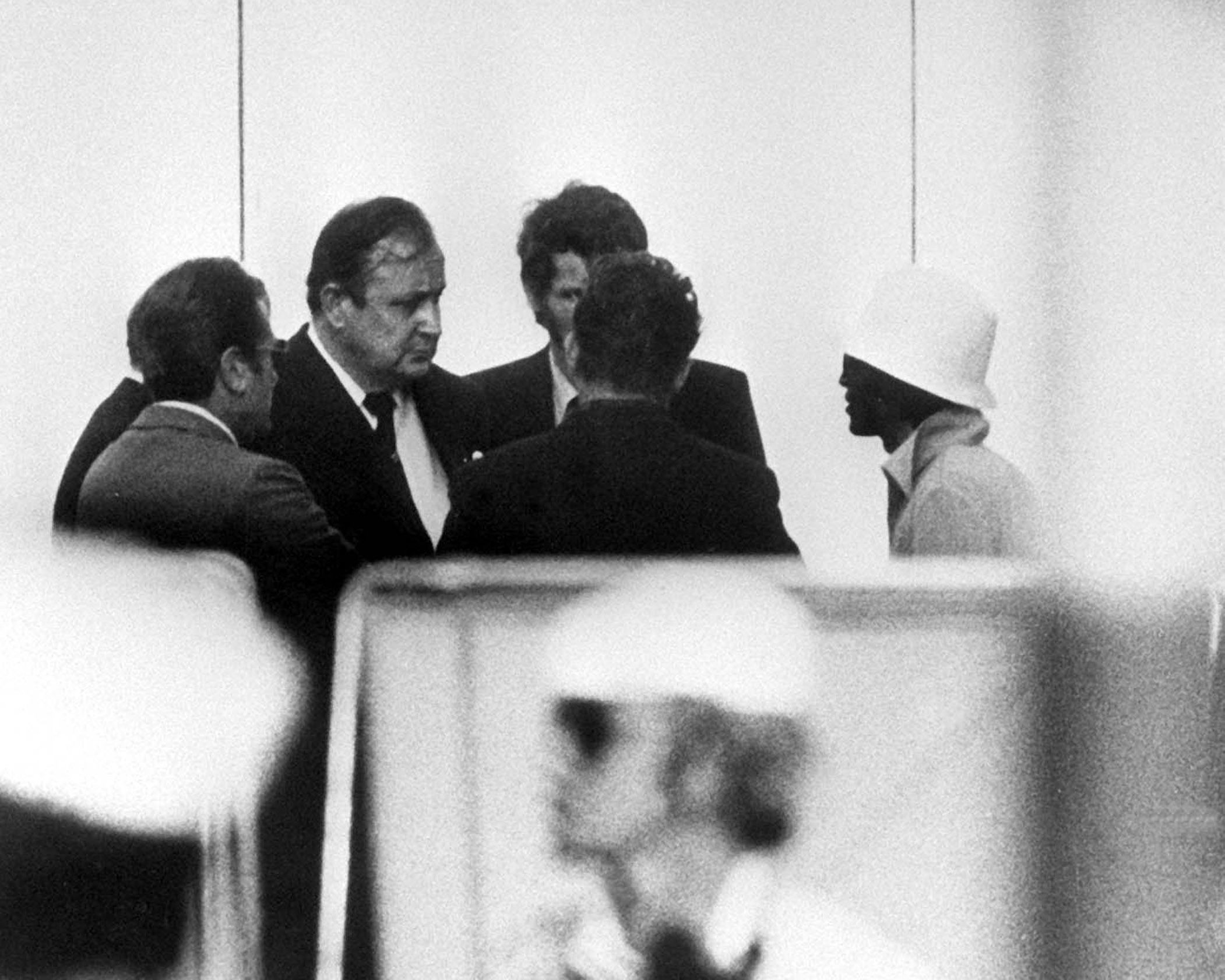 Der damalige BRD-Innenminister Hans-Dietrich Genscher (Zweiter von links) bei Verhandlungen mit Issa (ganz rechts), dem Anführer der Geiselnehmer.