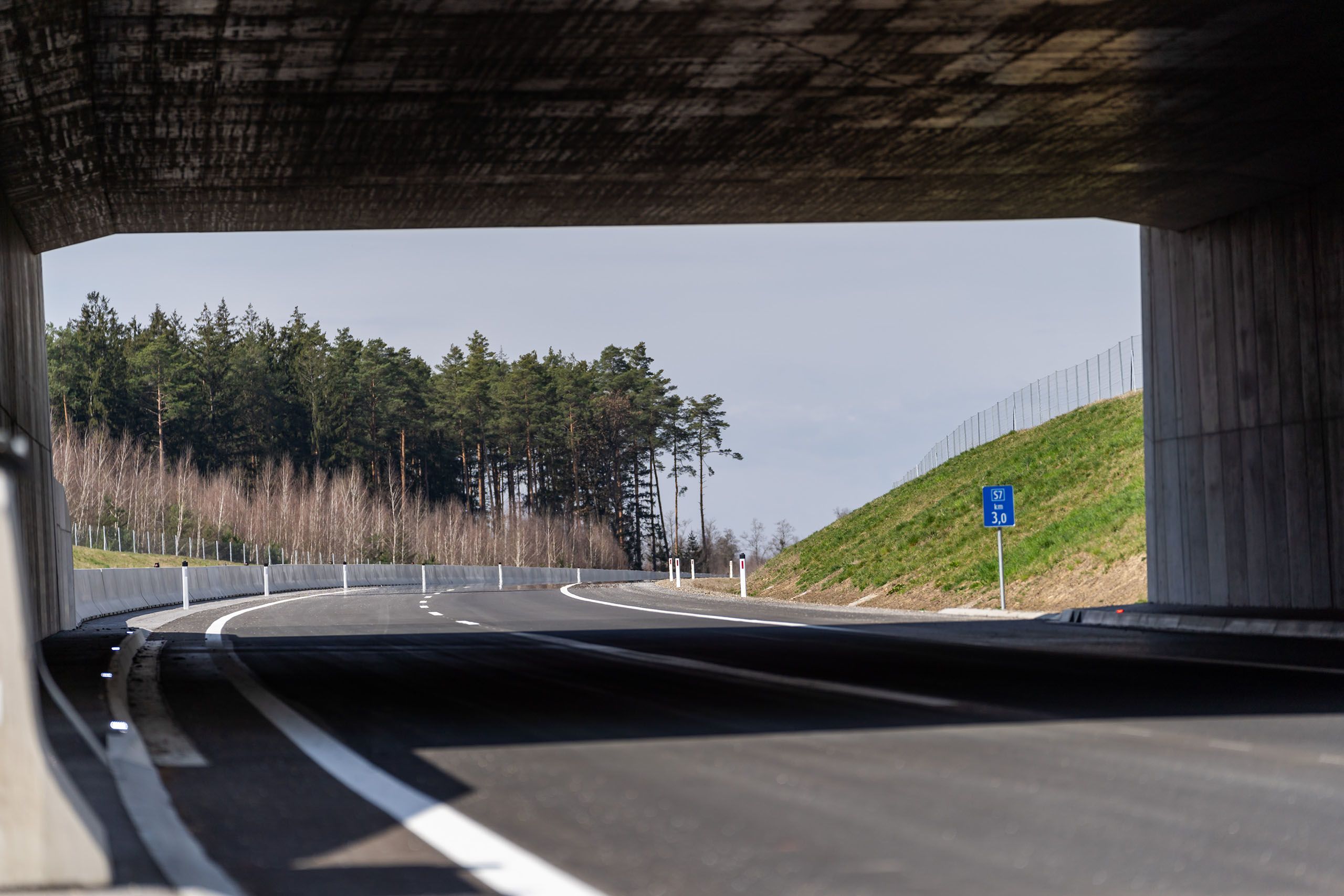 Blick auf das Portal des Tunnels Rudersdorf, die provisorische Anschlussstelle bei Dobersdorf und eine der drei Großbrücken