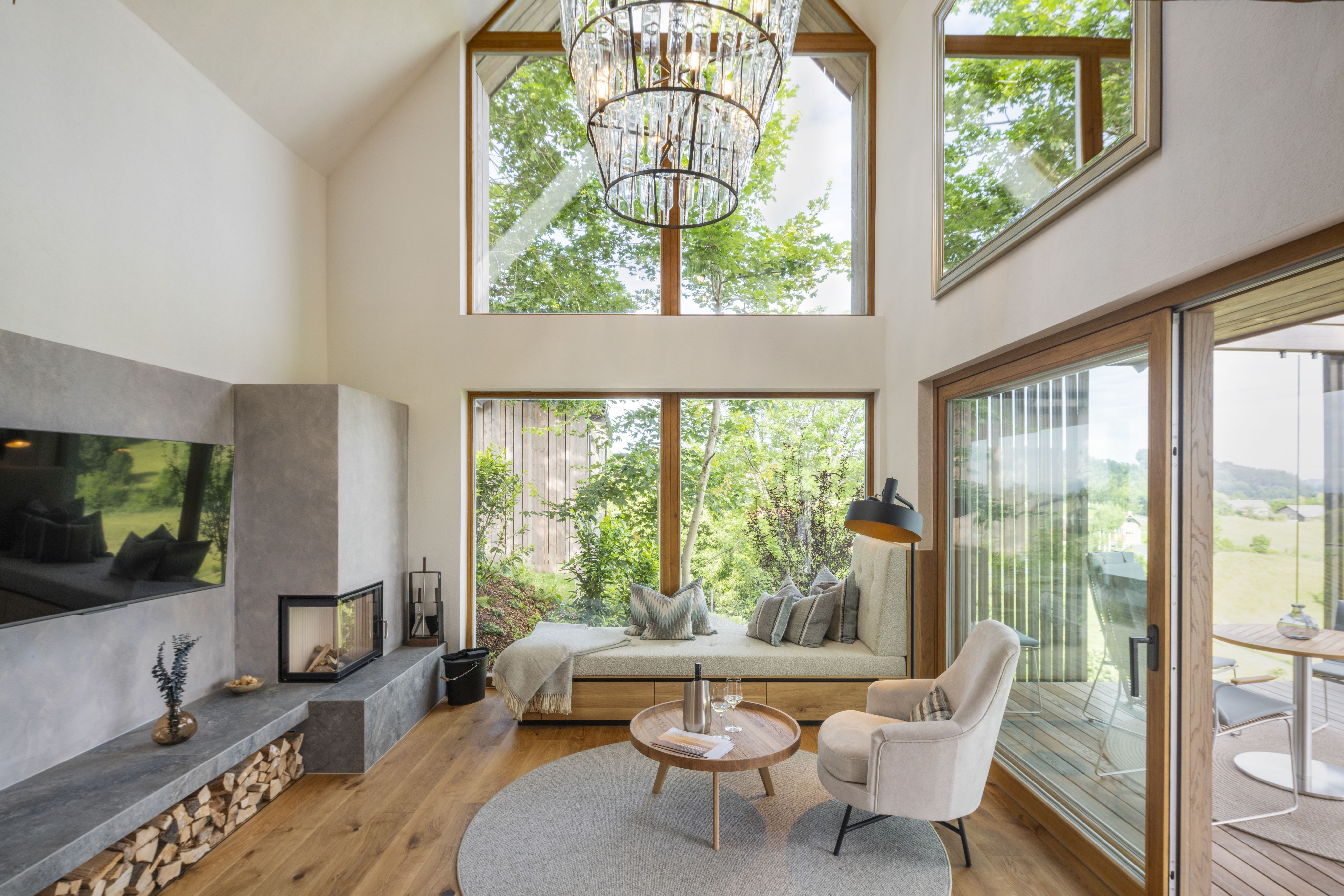 Der Wohnbereich der Winzerhäuser ist ein Ort der Geborgenheit und des Wohlfühlens. Die gemütliche Sitzecke mit Kamin und TV lädt zum Verweilen ein. Große Fenster eröffnen Ihnen einen traumhaften Ausblick und bieten direkten Zugang zur privaten Terrasse. Hier können Sie die Ruhe und Schönheit der Südsteiermark in vollen Zügen genießen. Auch die Badezimmer und Schlafzimmer der Winzerhäuser sind mit viel Liebe zum Detail gestaltet.