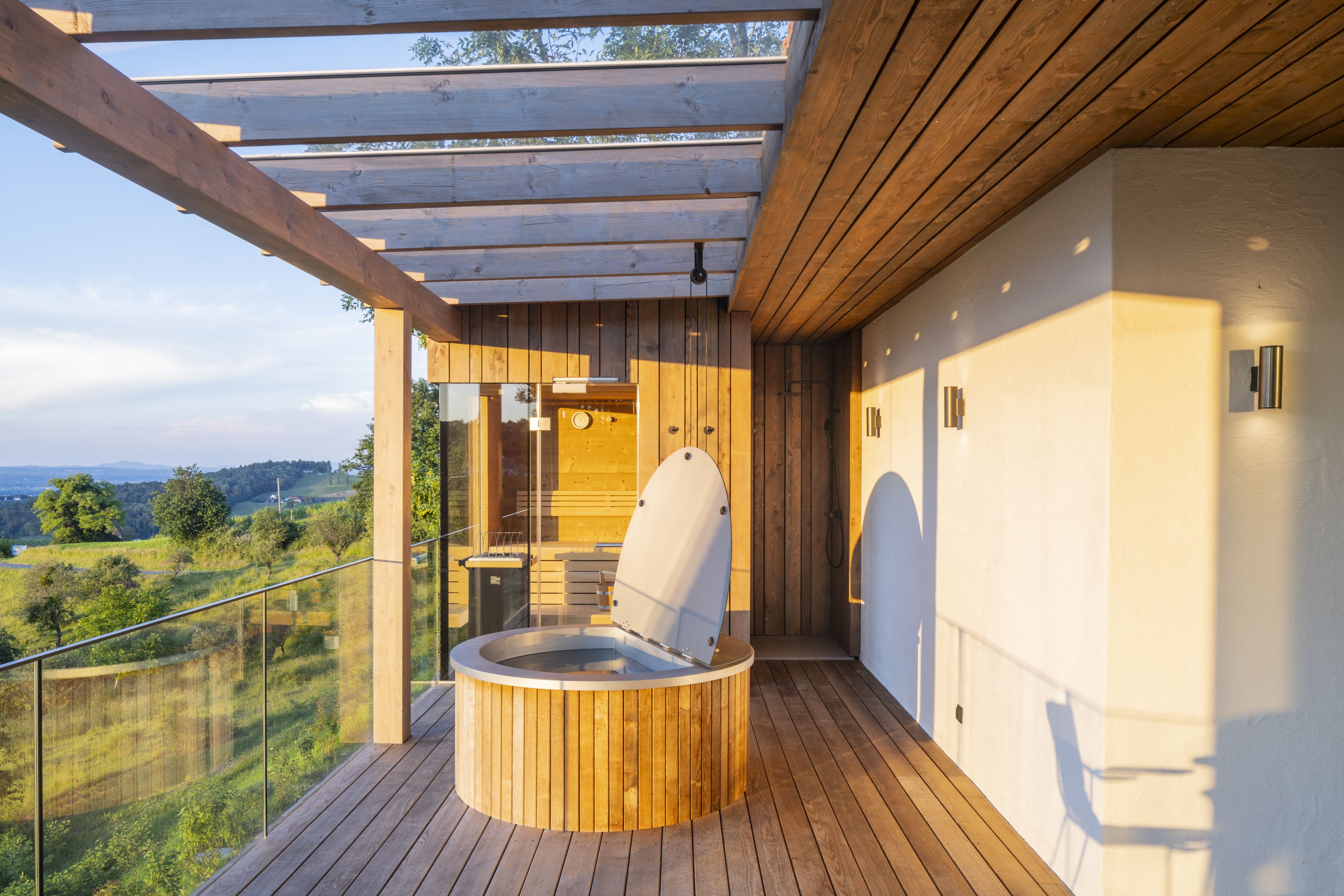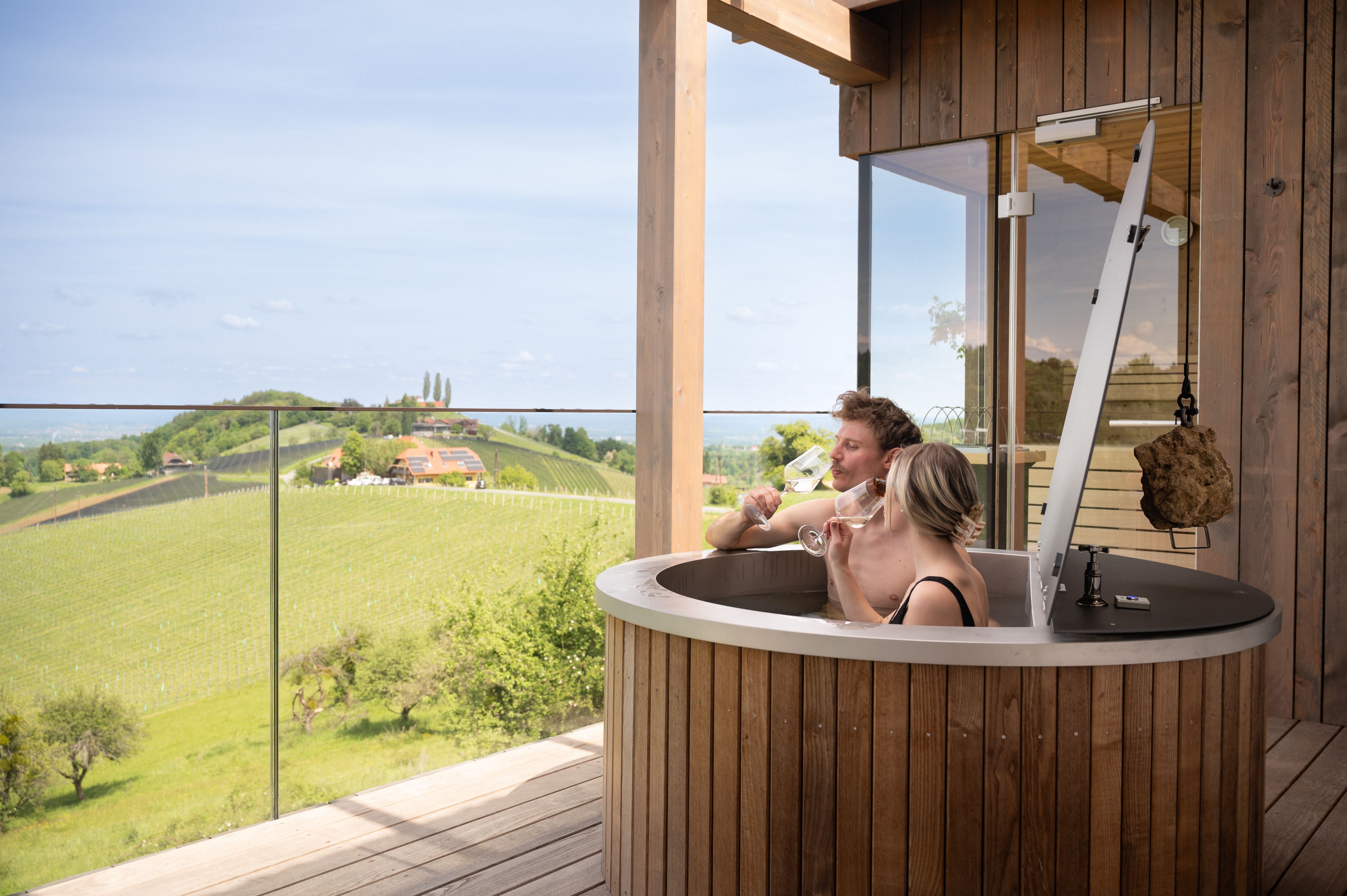 Erleben Sie Luxus neu gedacht in den Winzerhäusern. Auf der großzügigen Terrasse können Sie im Hot Tub oder in der Panoramasauna entspannen, umgeben von einer privaten Atmosphäre, die ihresgleichen sucht. Die Außendusche und der Tisch mit Stühlen laden dazu ein, den Tag mit einem Frühstück im Freien zu beginnen oder den Abend bei einem Glas Wein ausklingen zu lassen.