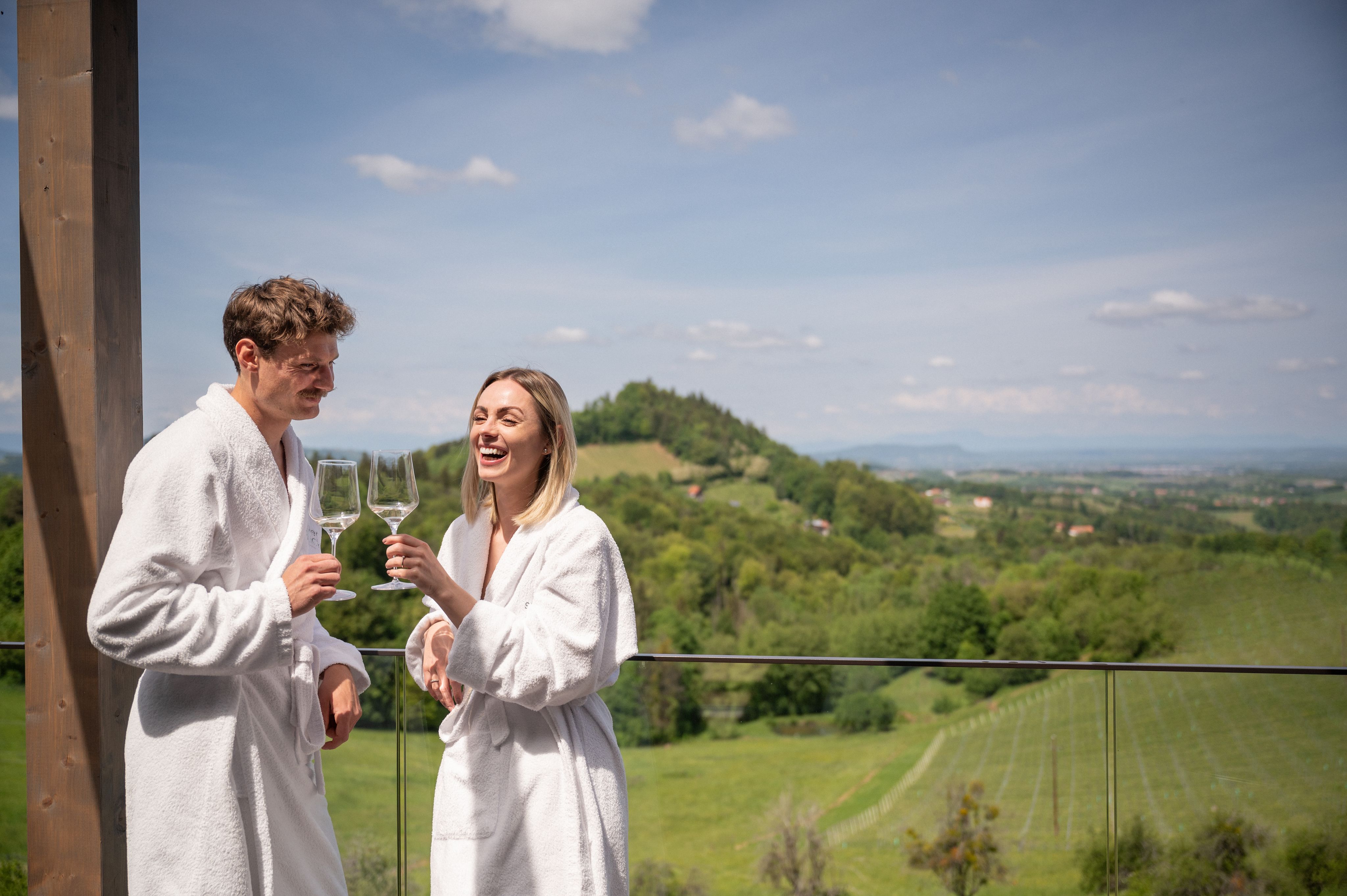 Die Häuser sind nicht nur optisch perfekt in die Landschaft integriert, sondern bieten Ihnen auch ein Höchstmaß an Privatsphäre und Komfort. Die Giebeldächer und Naturmaterialien fügen sich harmonisch in die Umgebung ein, während die großzügigen Glasflächen Ihnen einen ungehinderten Blick auf die Weinberge ermöglichen.