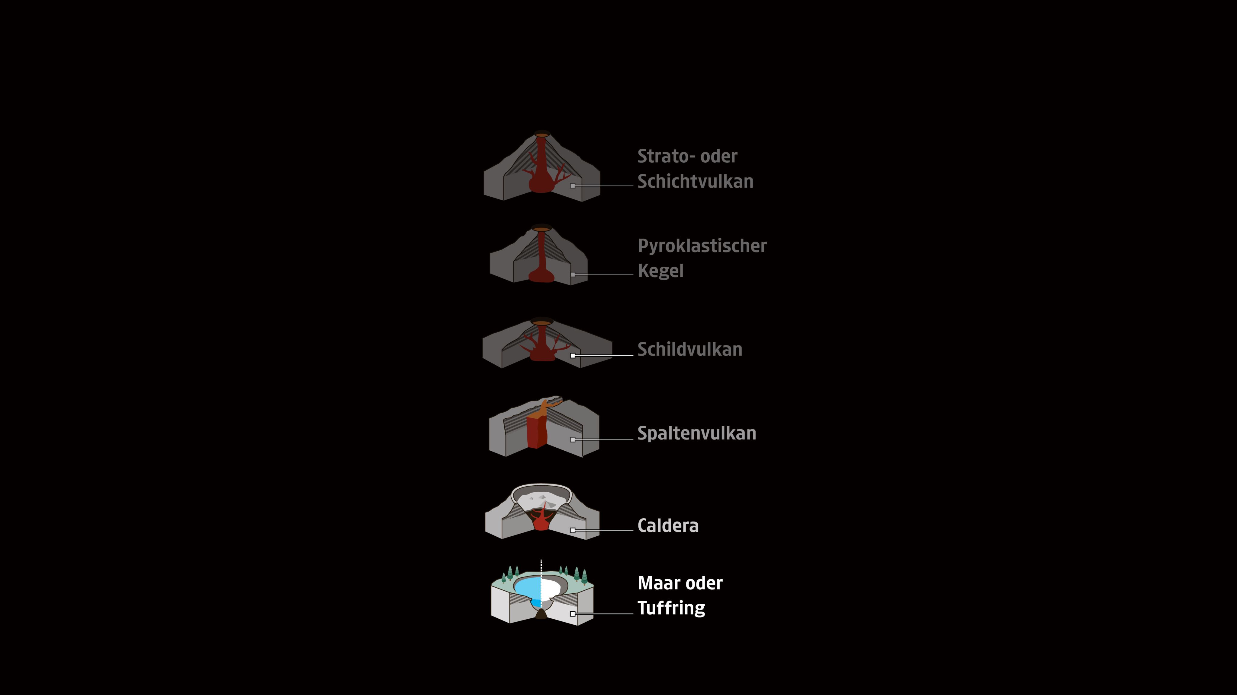 Maar oder Tuffring: Durch eine heftige Explosion eines Vulkans entsteht eine Mulde, die entweder mit Wasser gefüllt sein kann (Maarsee) oder nicht.