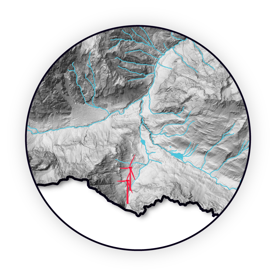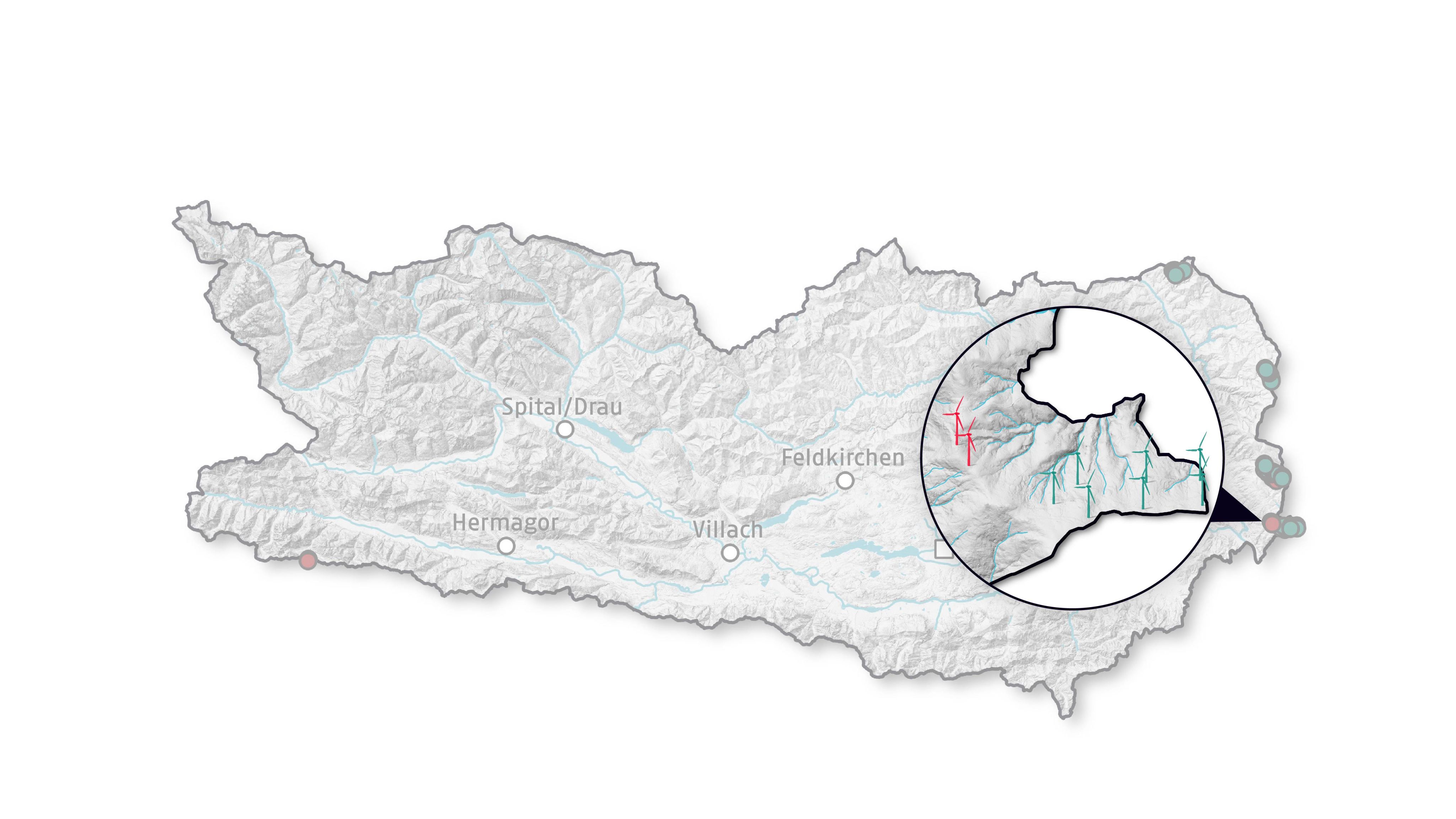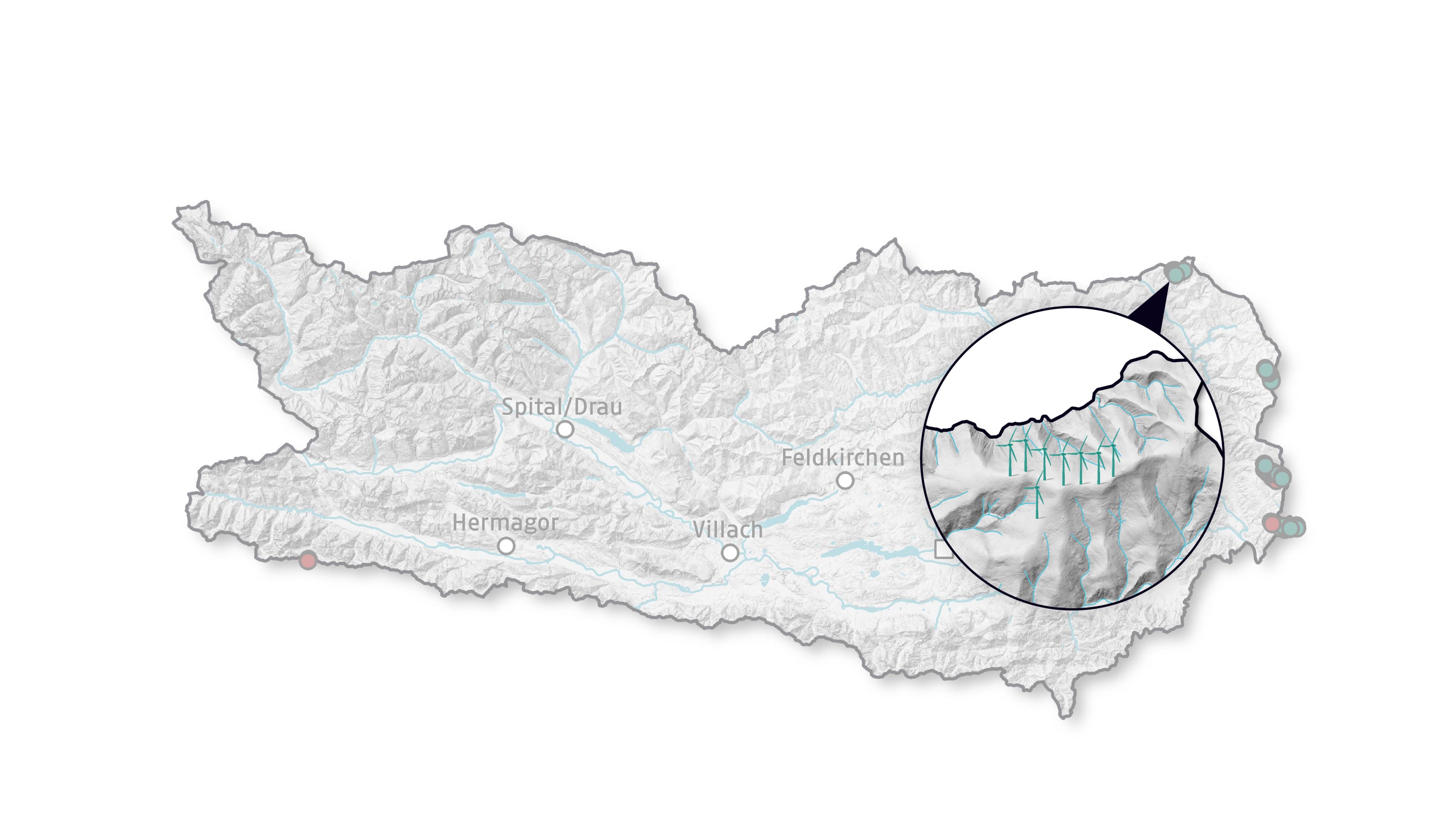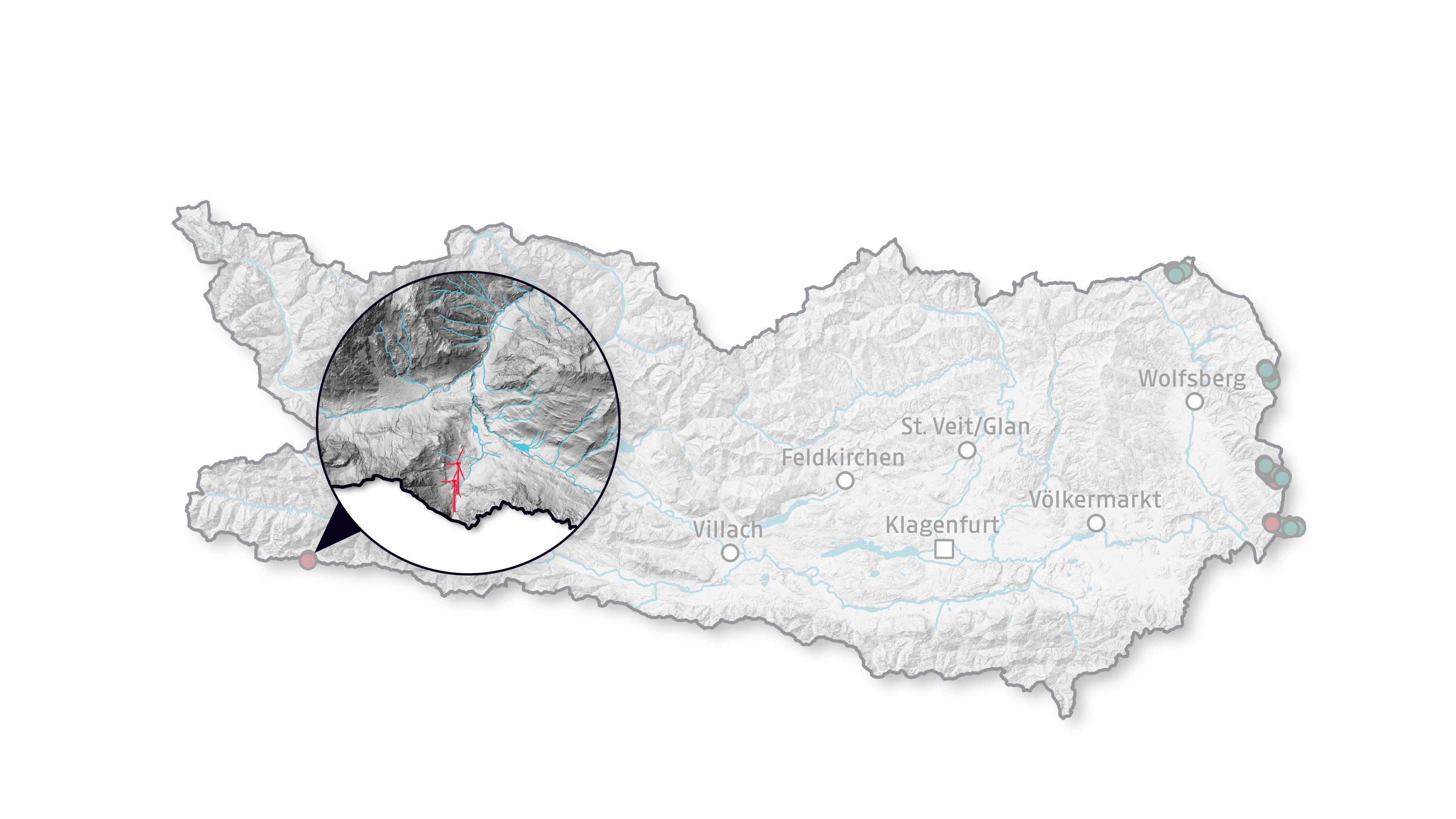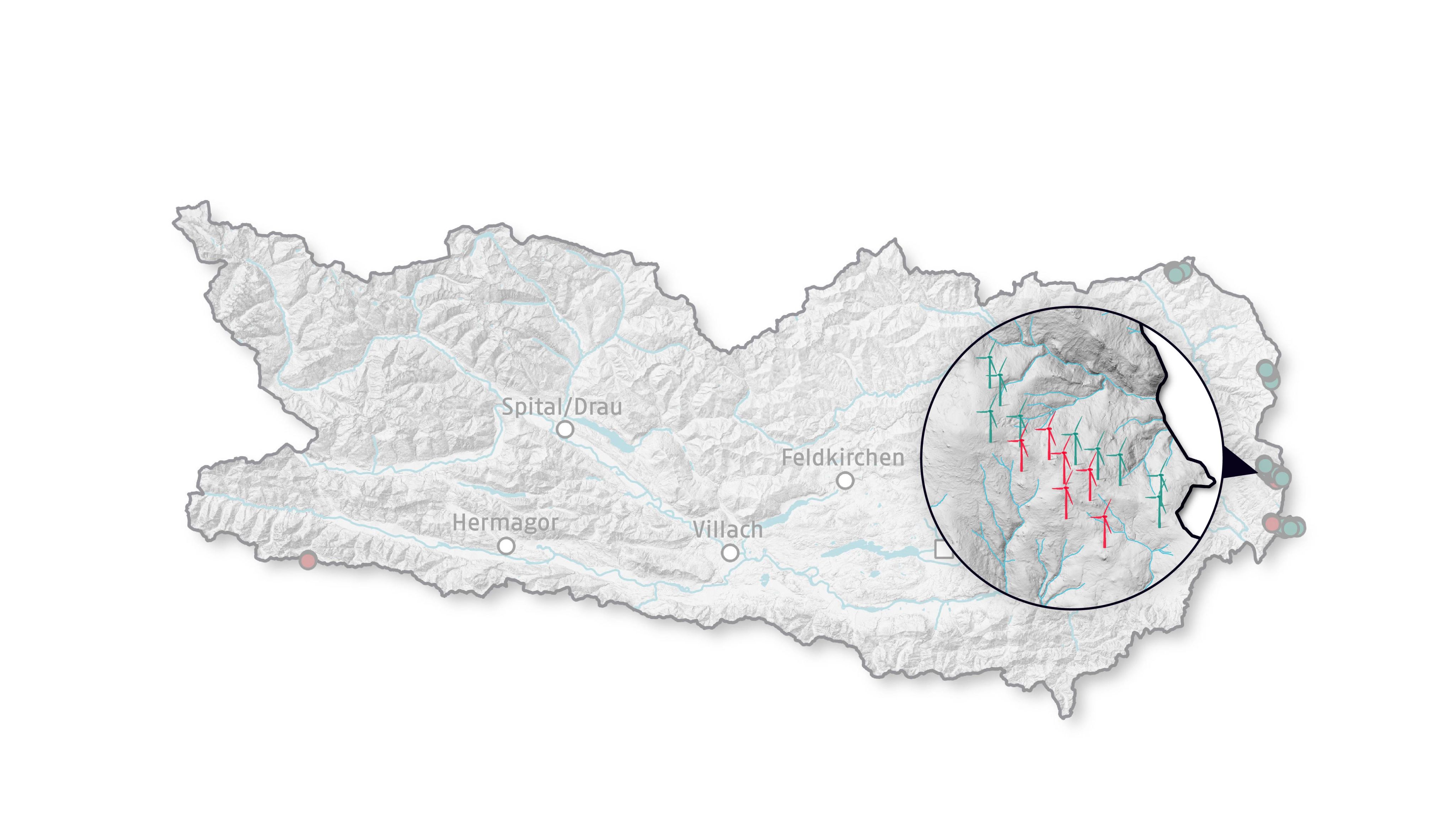 Hinweis: Die Lage der geplanten Windräder ist ungefähr und anhand von Plänen nachgezeichnet, während die Bestandsanlagen anhand von Geodaten des Bundesamts für Eich- und Vermessungswesen verortet wurden. Die neuen (nicht maßstabsgetreuen) Windkraftzonen sind gemäß einer Karte des Landes Kärnten nachgezeichnet. Schematische Darstellung der Windräder, Größenverhältnisse zueinander bzw. zum Gelände sind nicht maßstabsgetreu.
