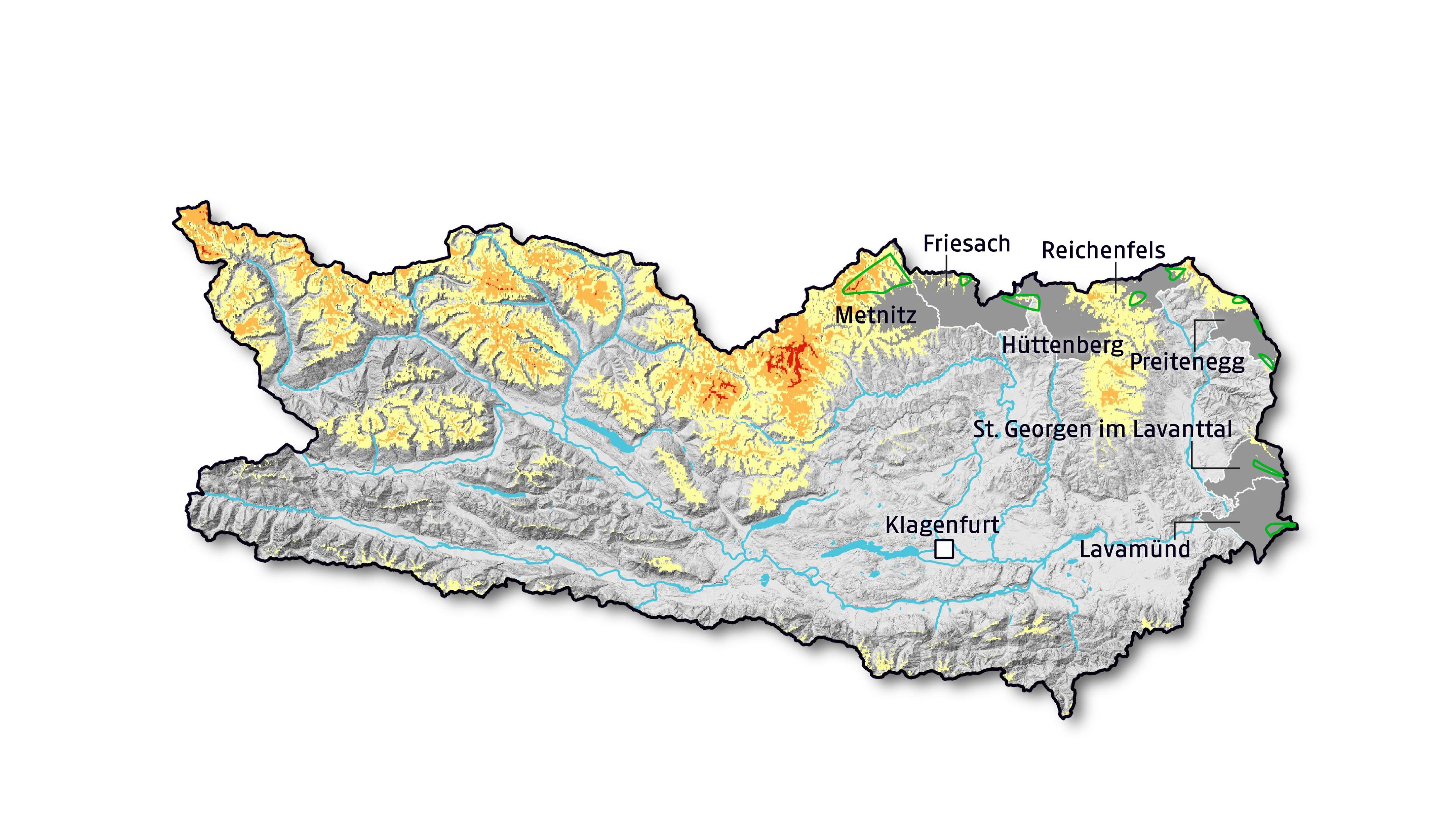Die ursprünglich geplanten Zonen erstrecken sich auf die sieben Gemeinden Metnitz, Friesach, Hüttenberg, Reichenfels, Preitenegg, St. Georgen im Lavanttal und Lavamünd. Alle liegen im Nordosten des Landes an der Grenze zur Steiermark, teilweise unweit von bestehenden steirischen Vorrangzonen.
