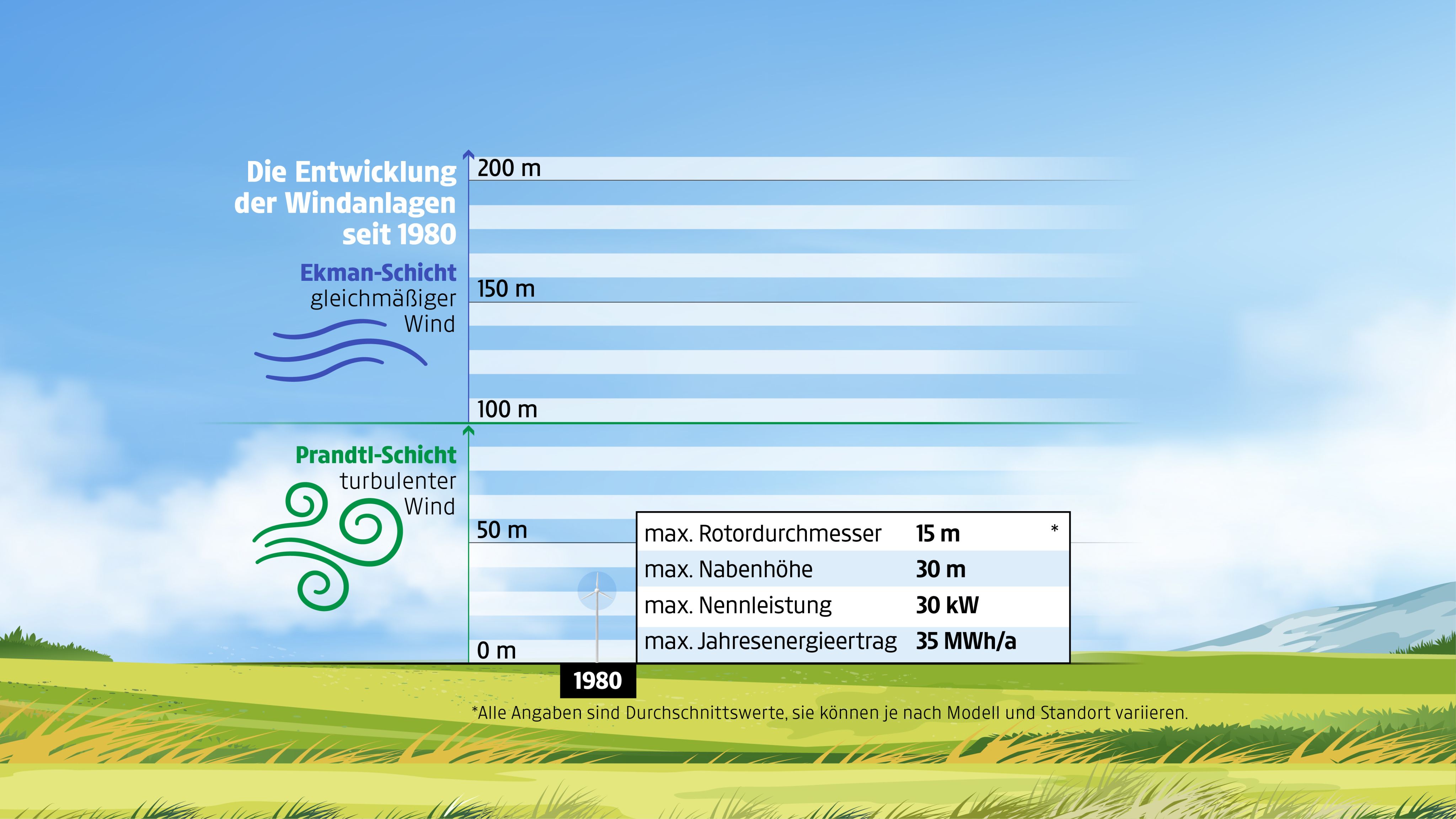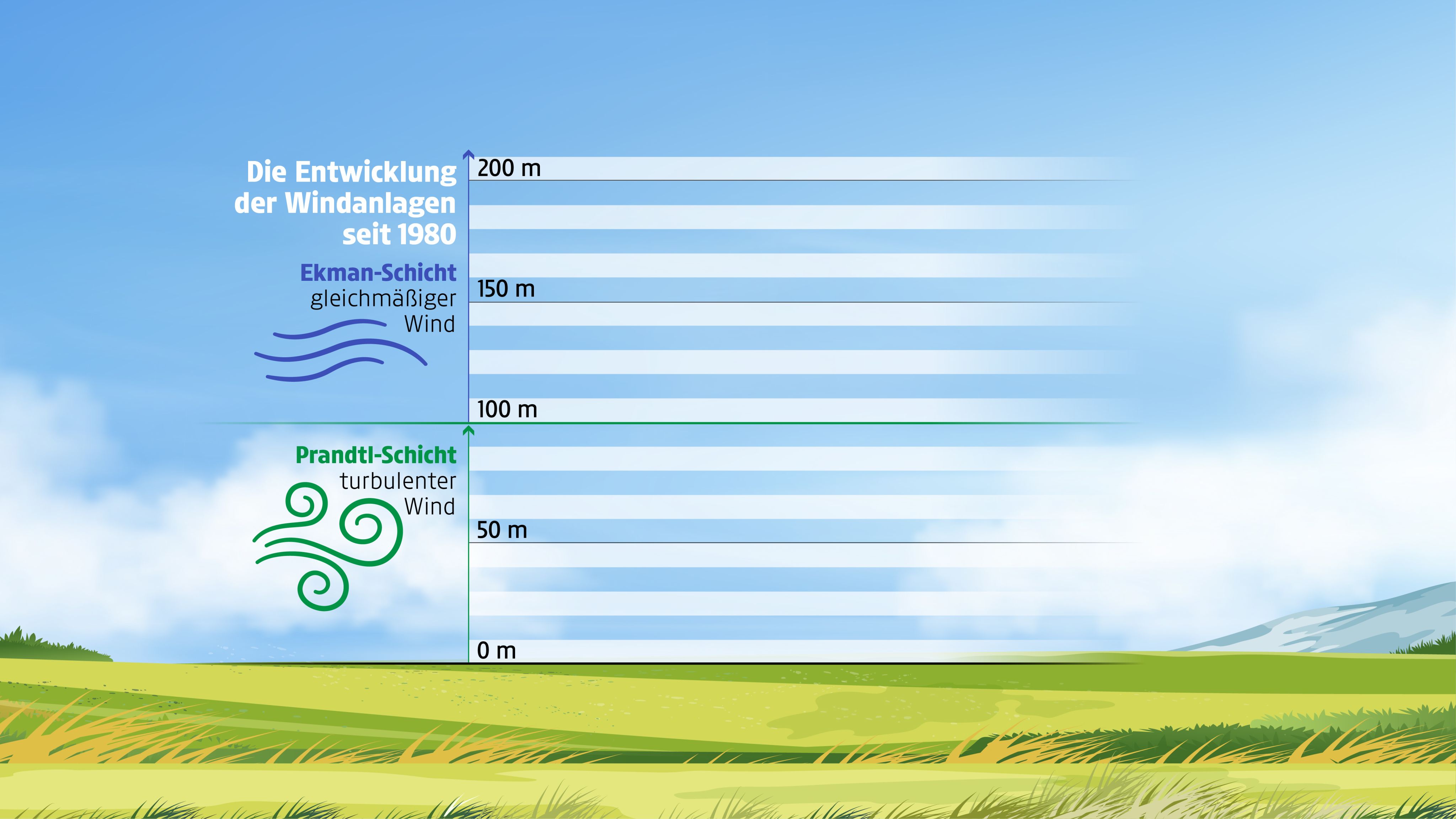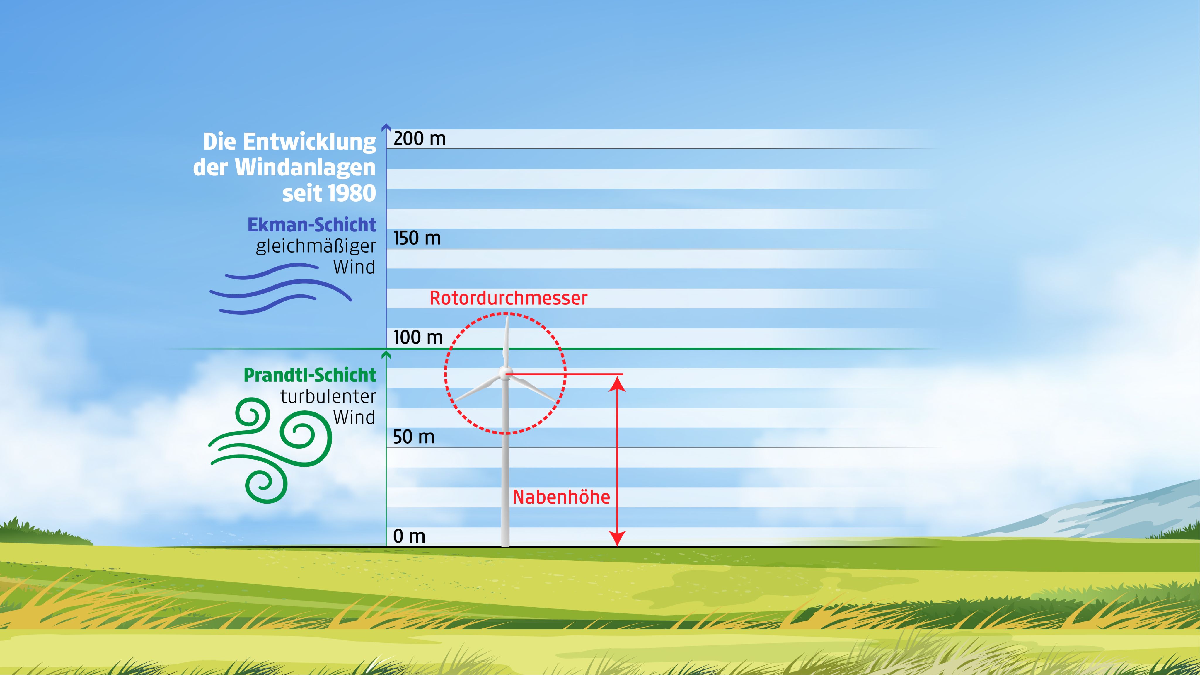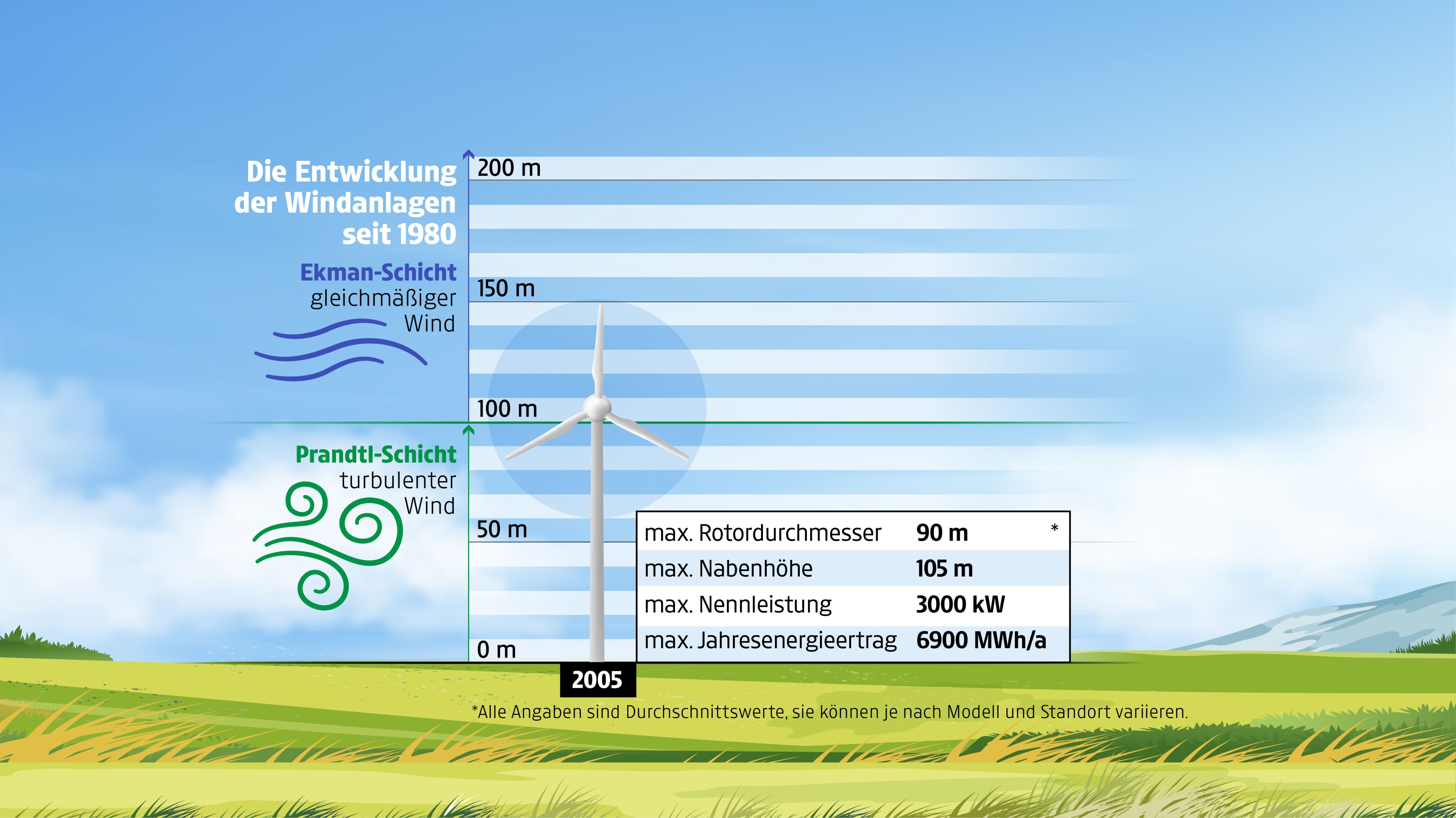 In den höheren Luftschichten bläst der Wind gleichmäßig konstant. Deshalb werden Windräder möglichst hoch gebaut.