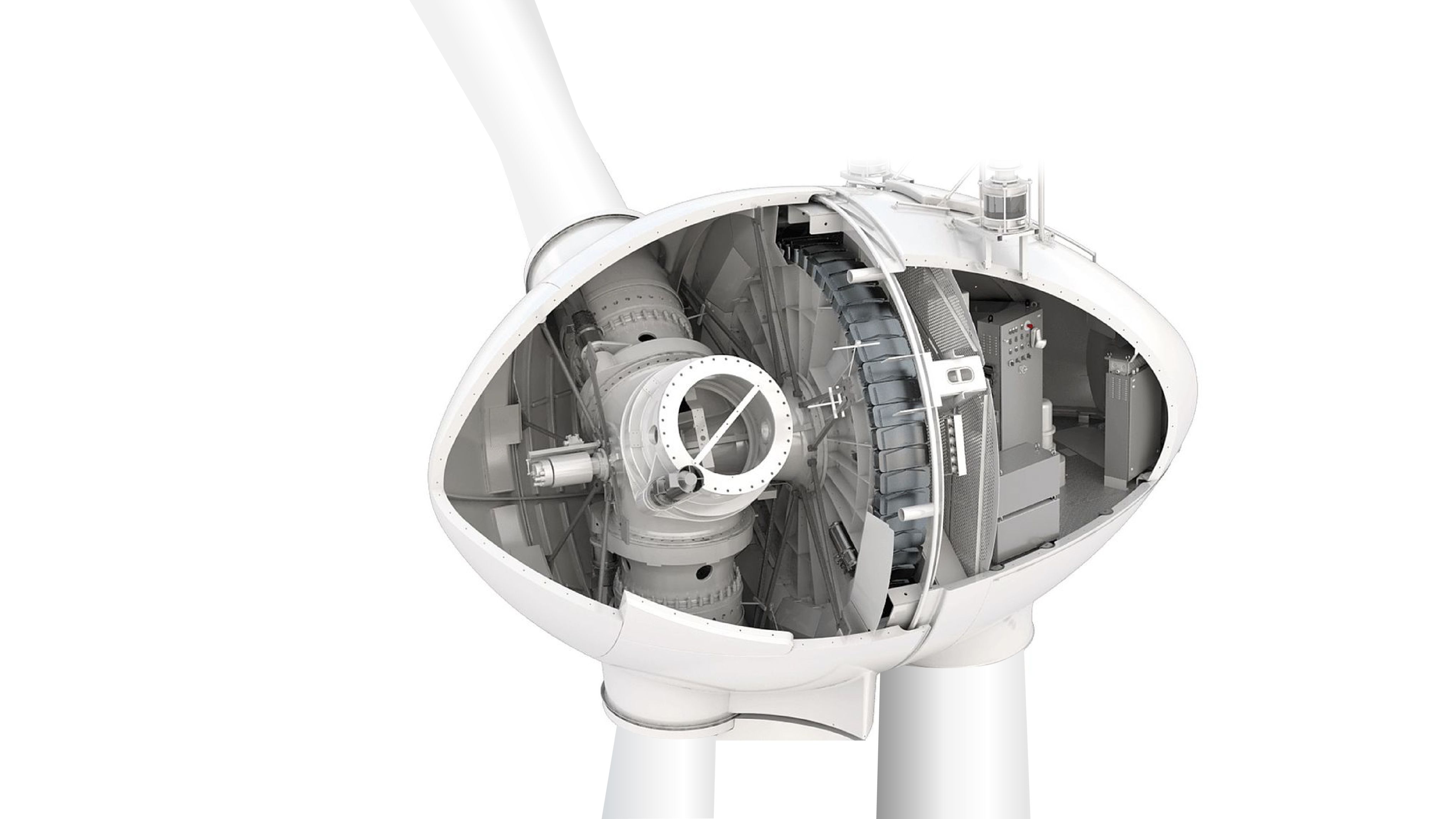 Die Gondel beherbergt mit Getriebe, Generator zur Stromerzeugung und zahlreichen Messsystemen die wichtigsten Komponenten der Anlage. Die Gondel ist drehbar und kann sich dadurch den Windrichtungen anpassen.