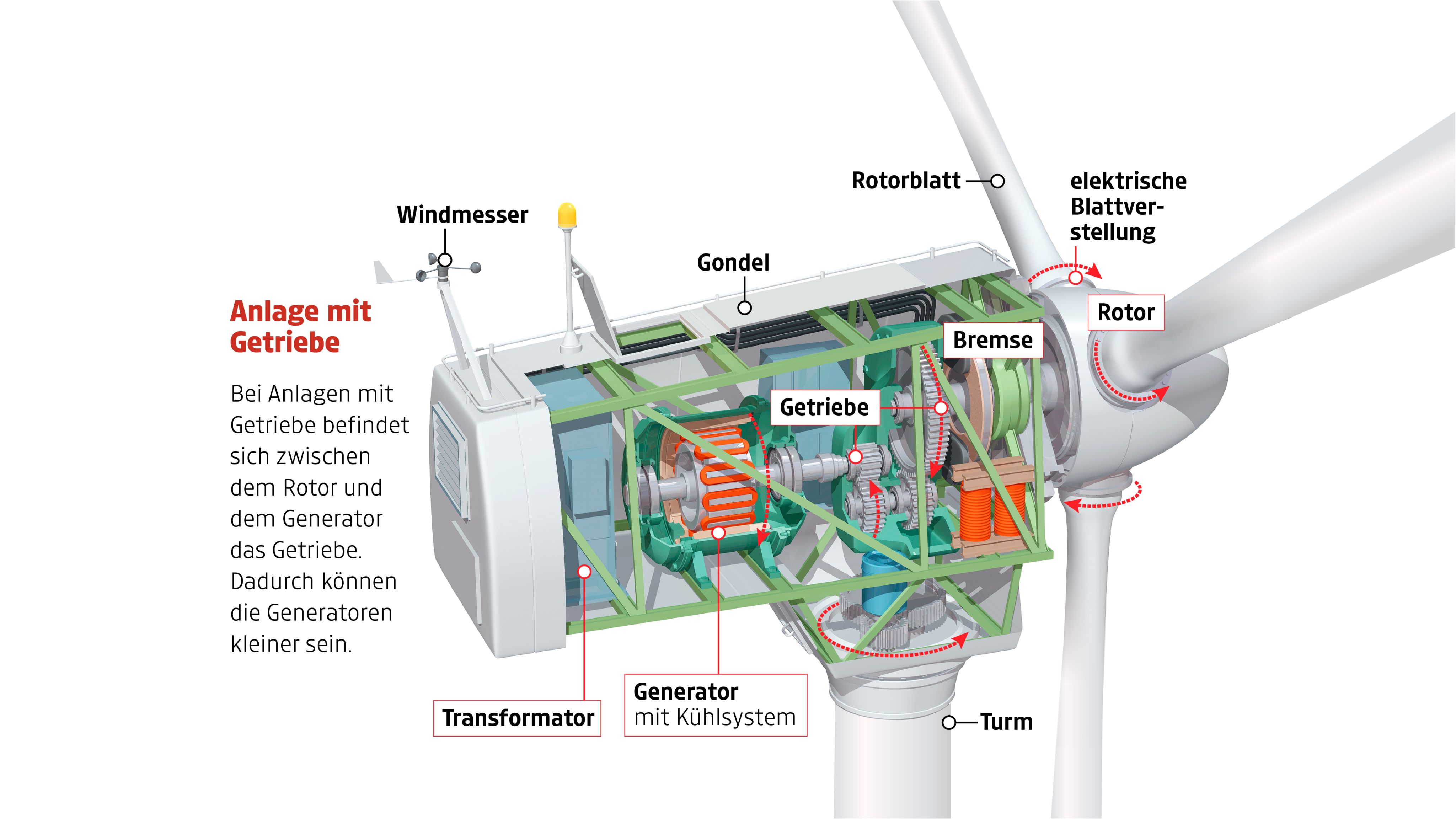 Das klassische Konzept – Rotor, Getriebe und Generator – ermöglicht kleinere Bauweisen (Gondeln).