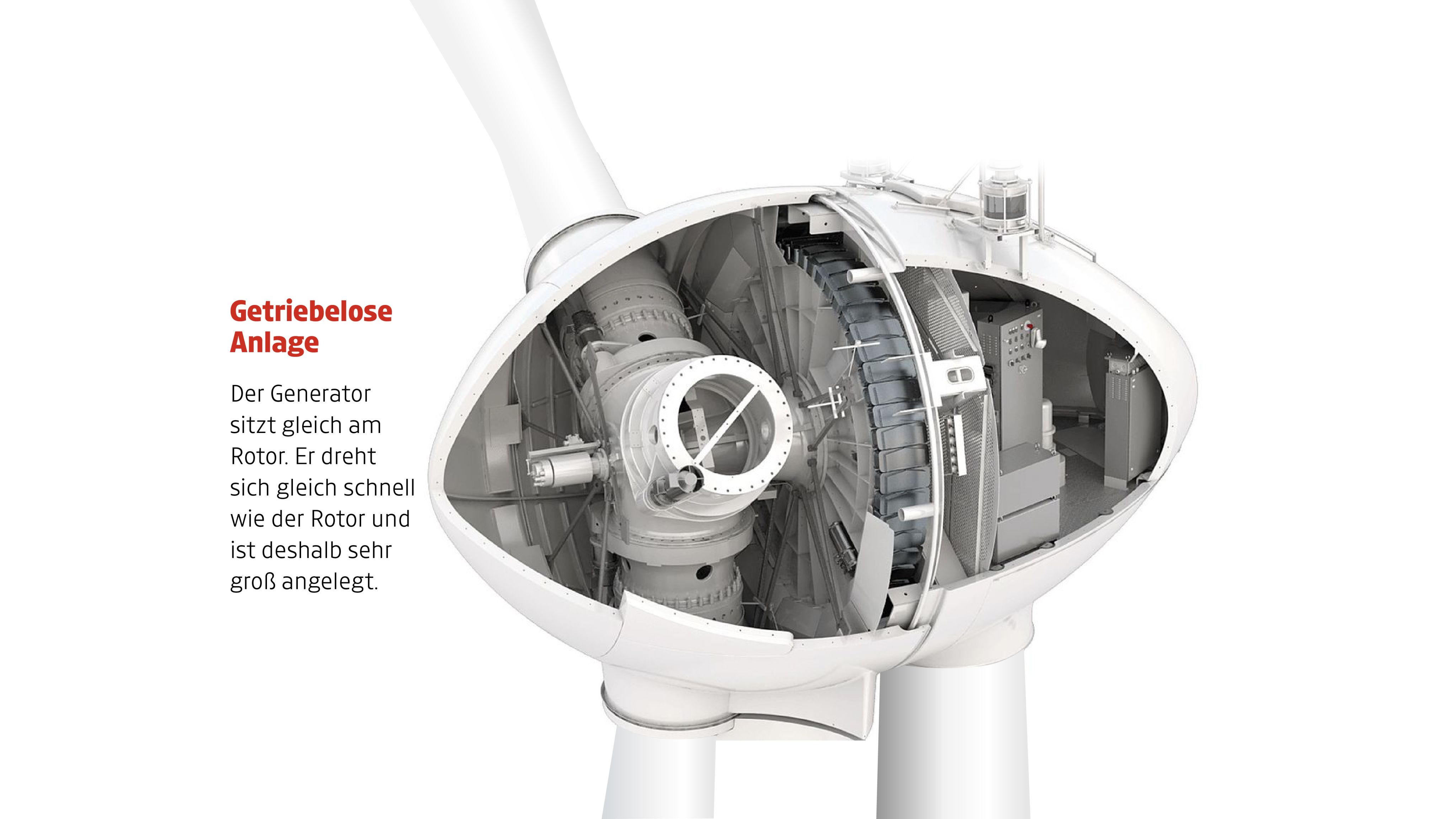Das getriebelose System ist sehr kompakt und kommt mit weniger Bauteilen aus, der Generator (Ringgenerator) ist schwerer und größer als bei Getriebeanlagen. Ringgeneratoren sind teurer als klassische Synchrongeneratoren.