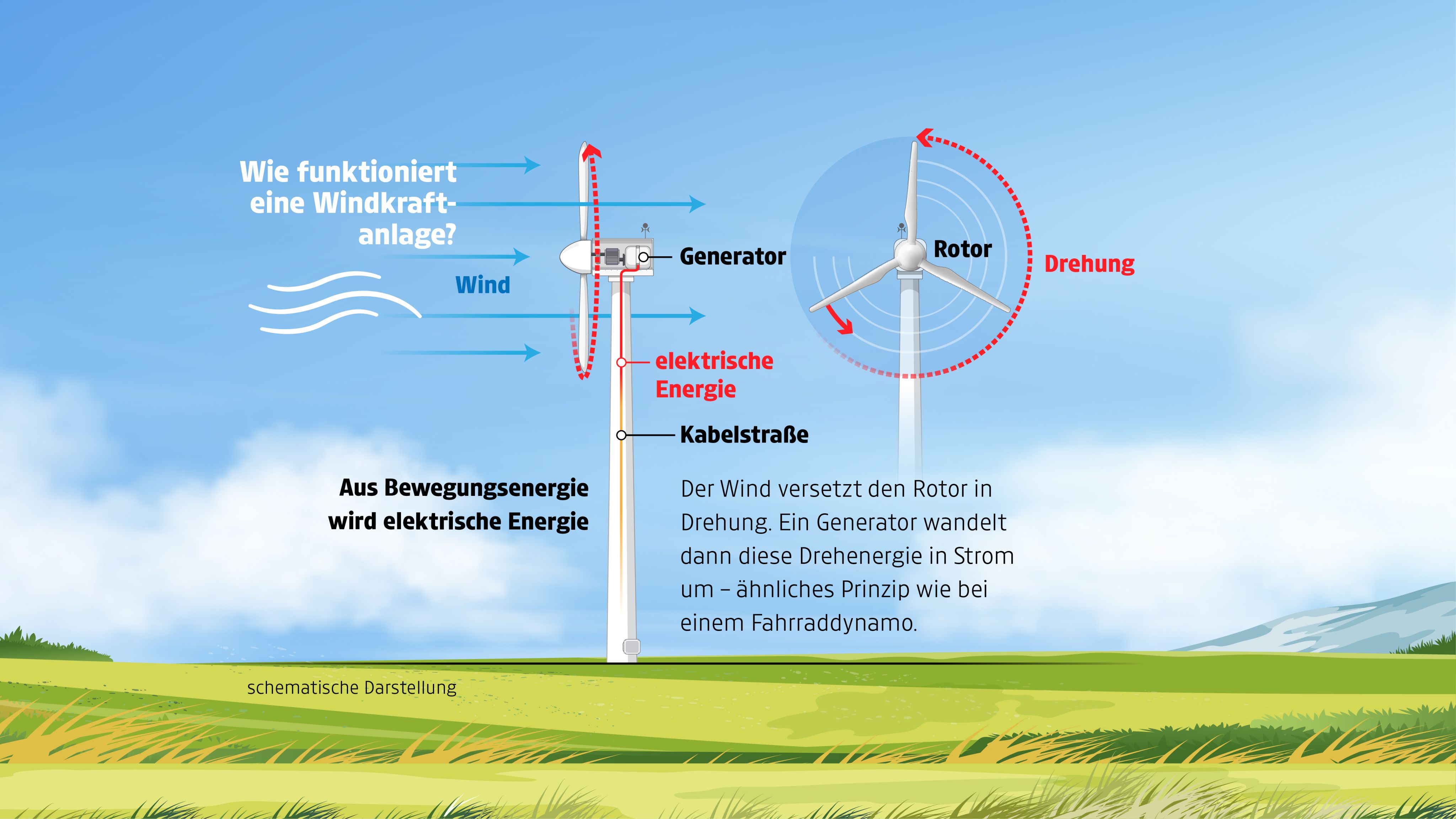 Das Prinzip der Energiegewinnung einer Windkraftanlage ist die Umwandlung der Bewegungsenergie des Windes in Strom.